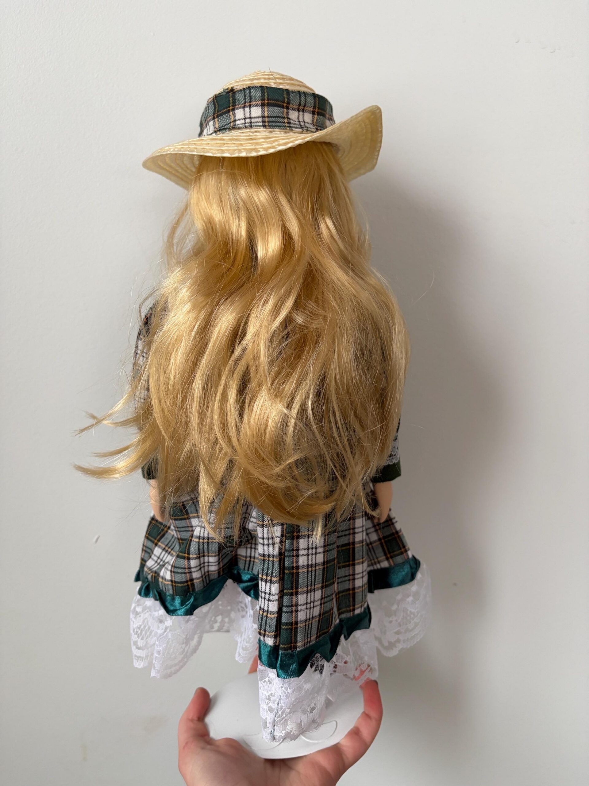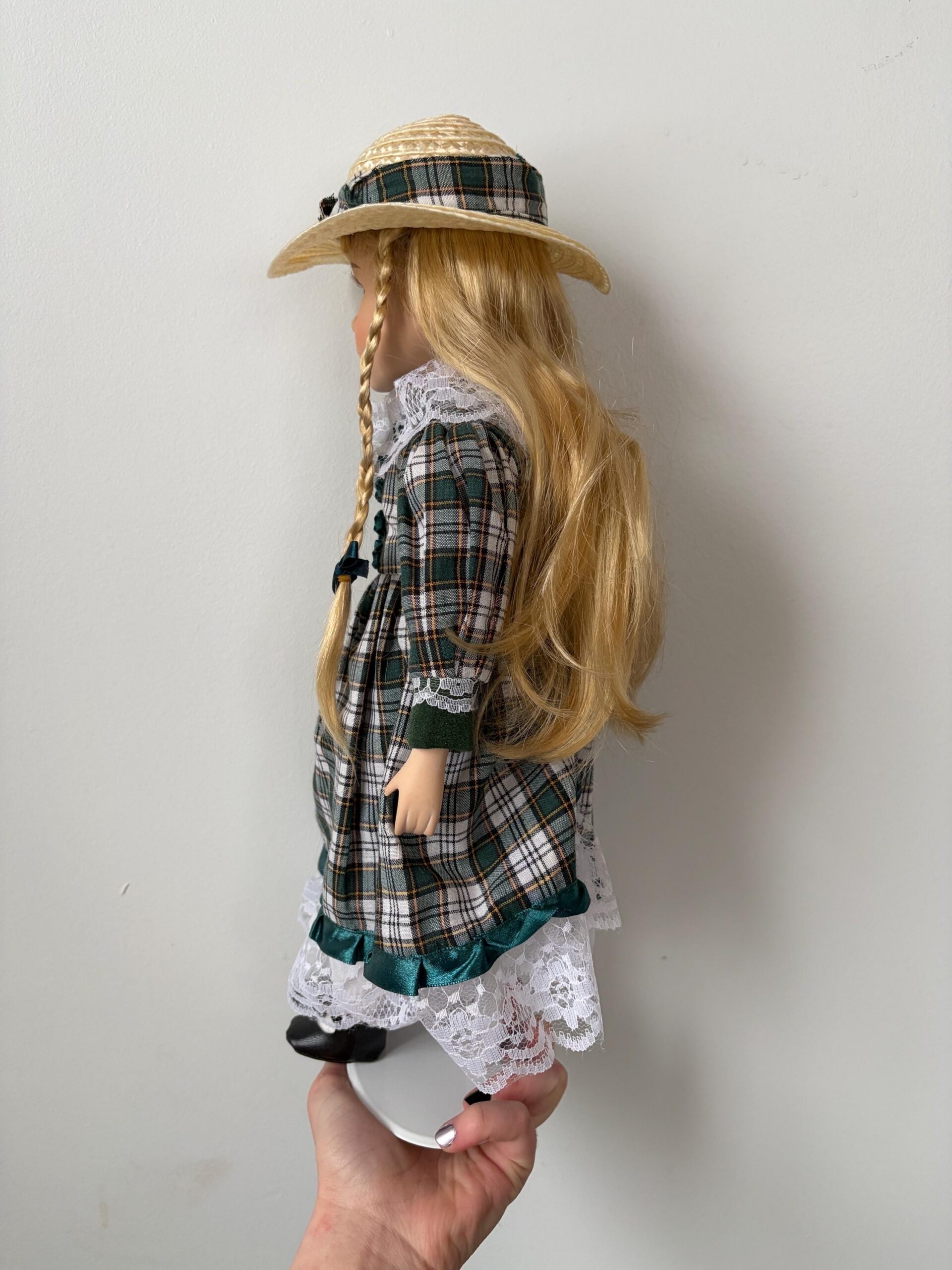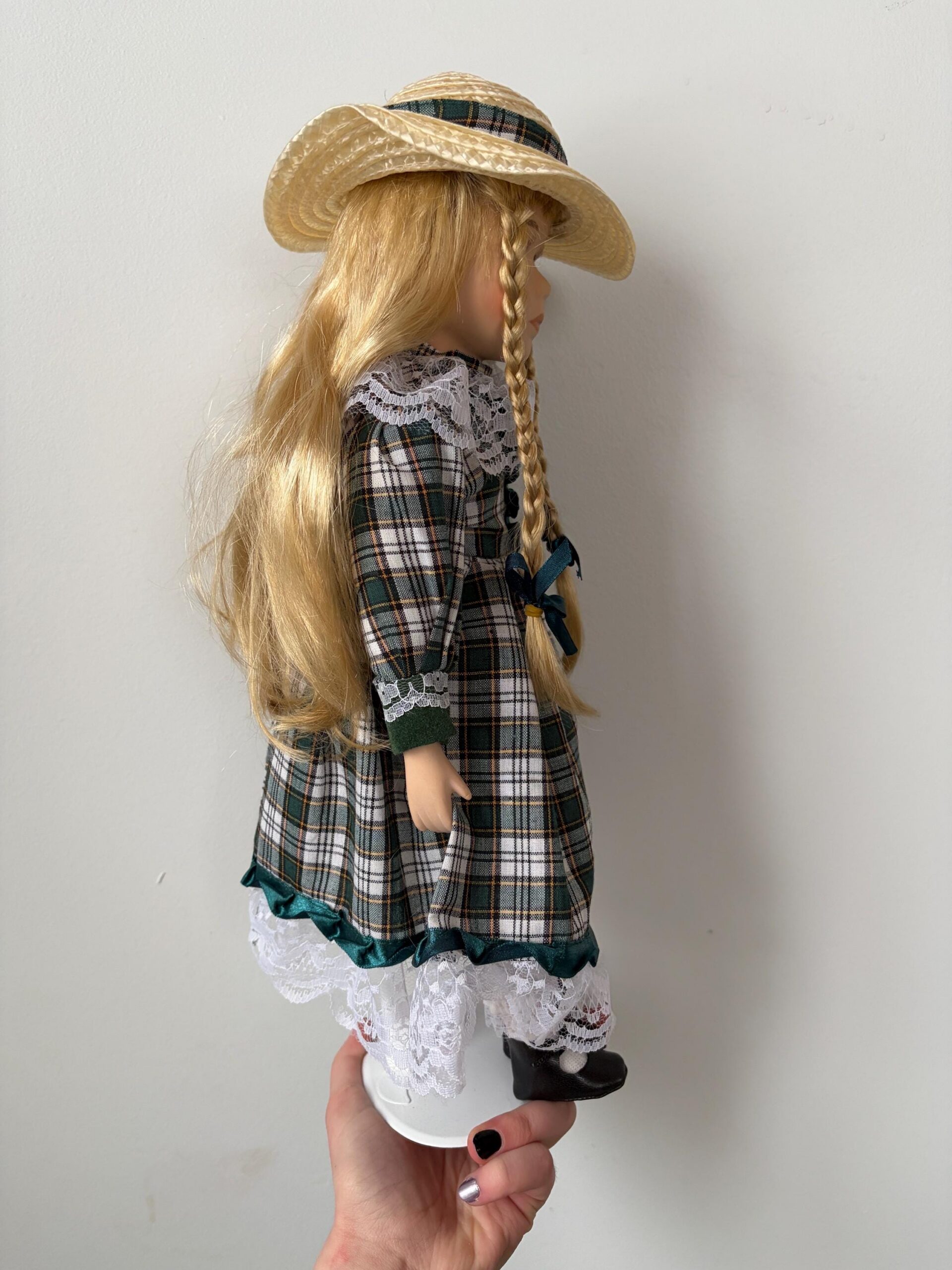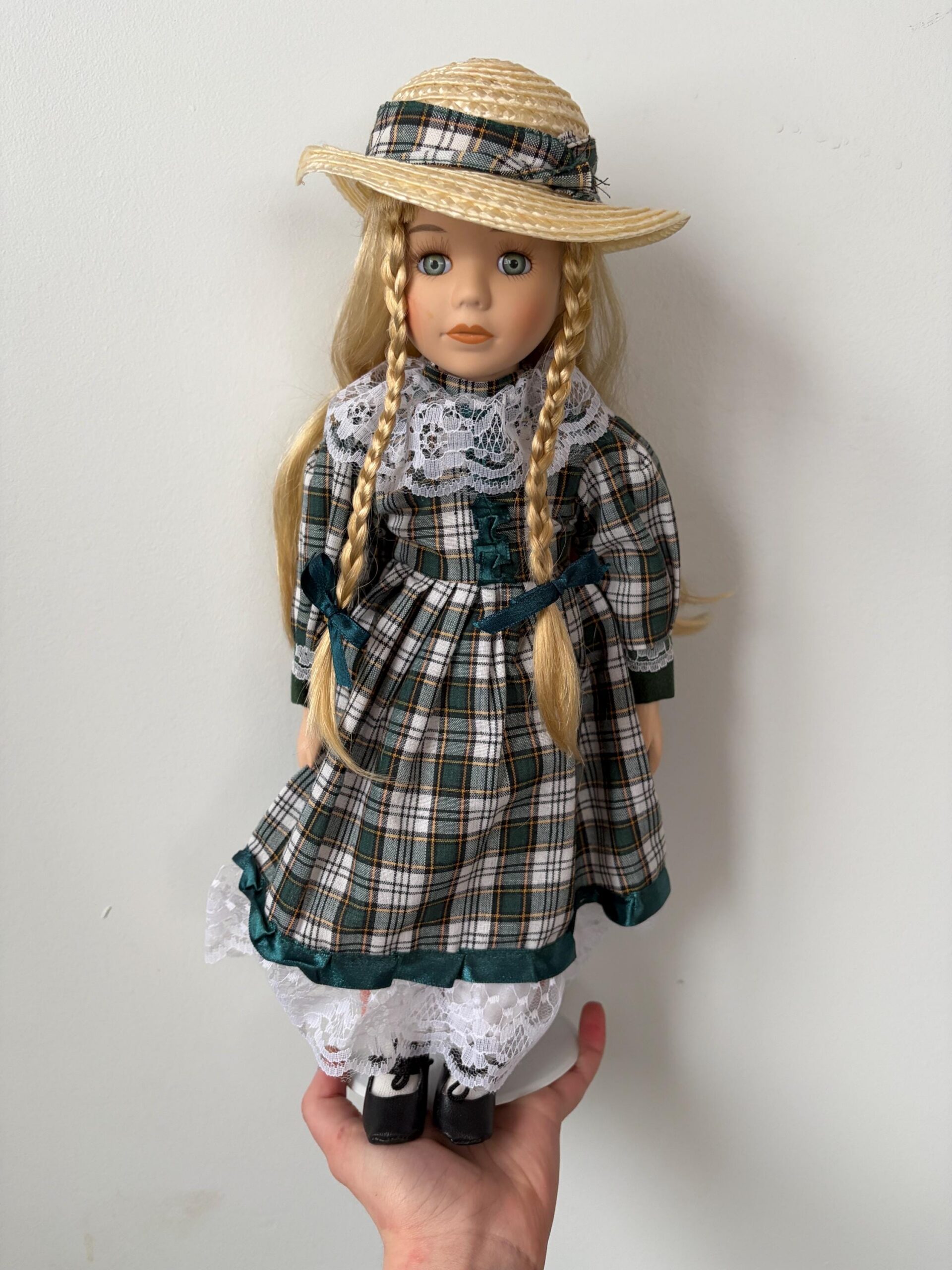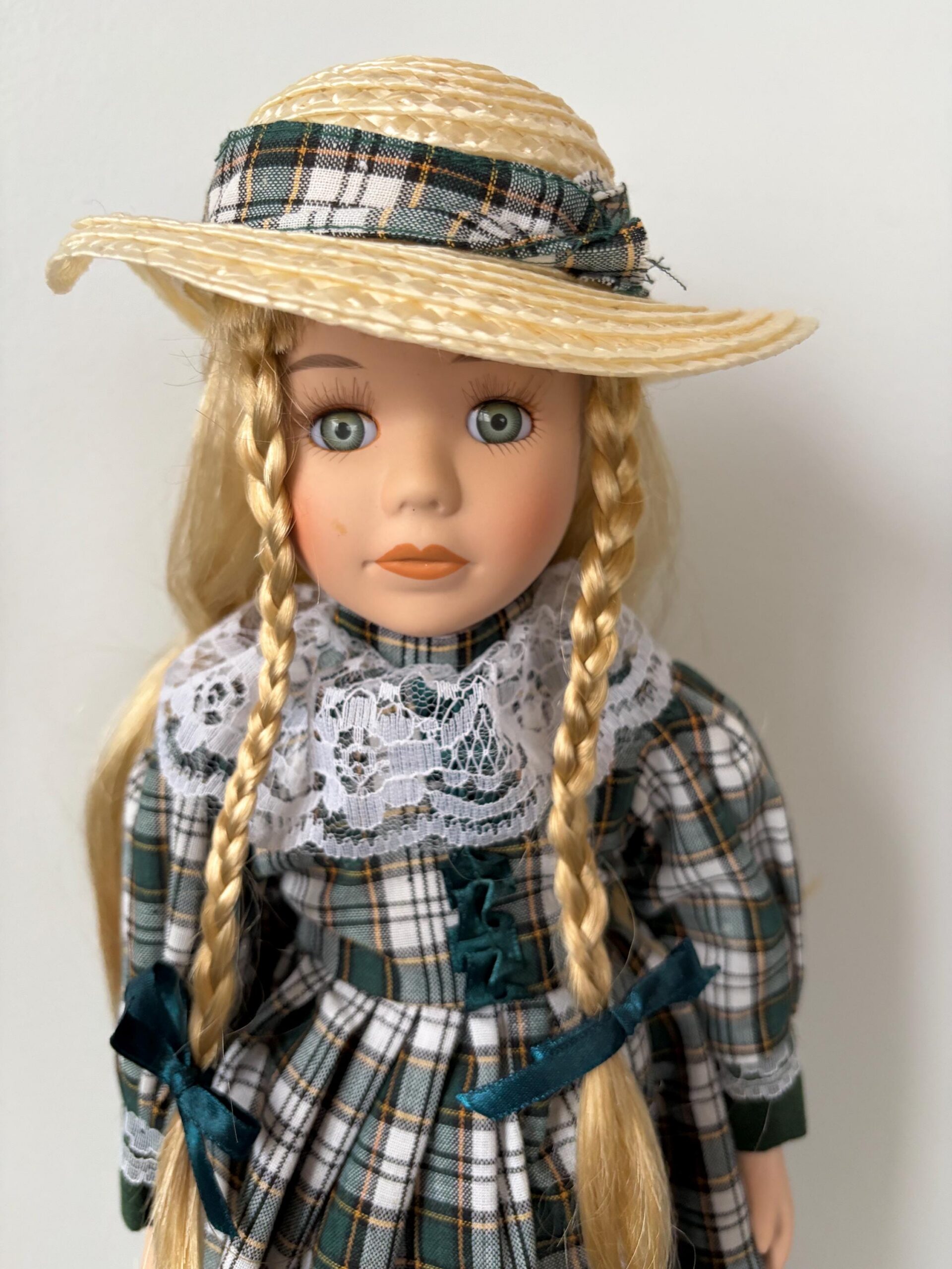 A charming vintage porcelain doll from the Century Collection, designed by artisan Rebecca Rose. Dressed in a green and white plaid dress with lace trim, straw hat, and black booties. Includes certificate of authenticity.