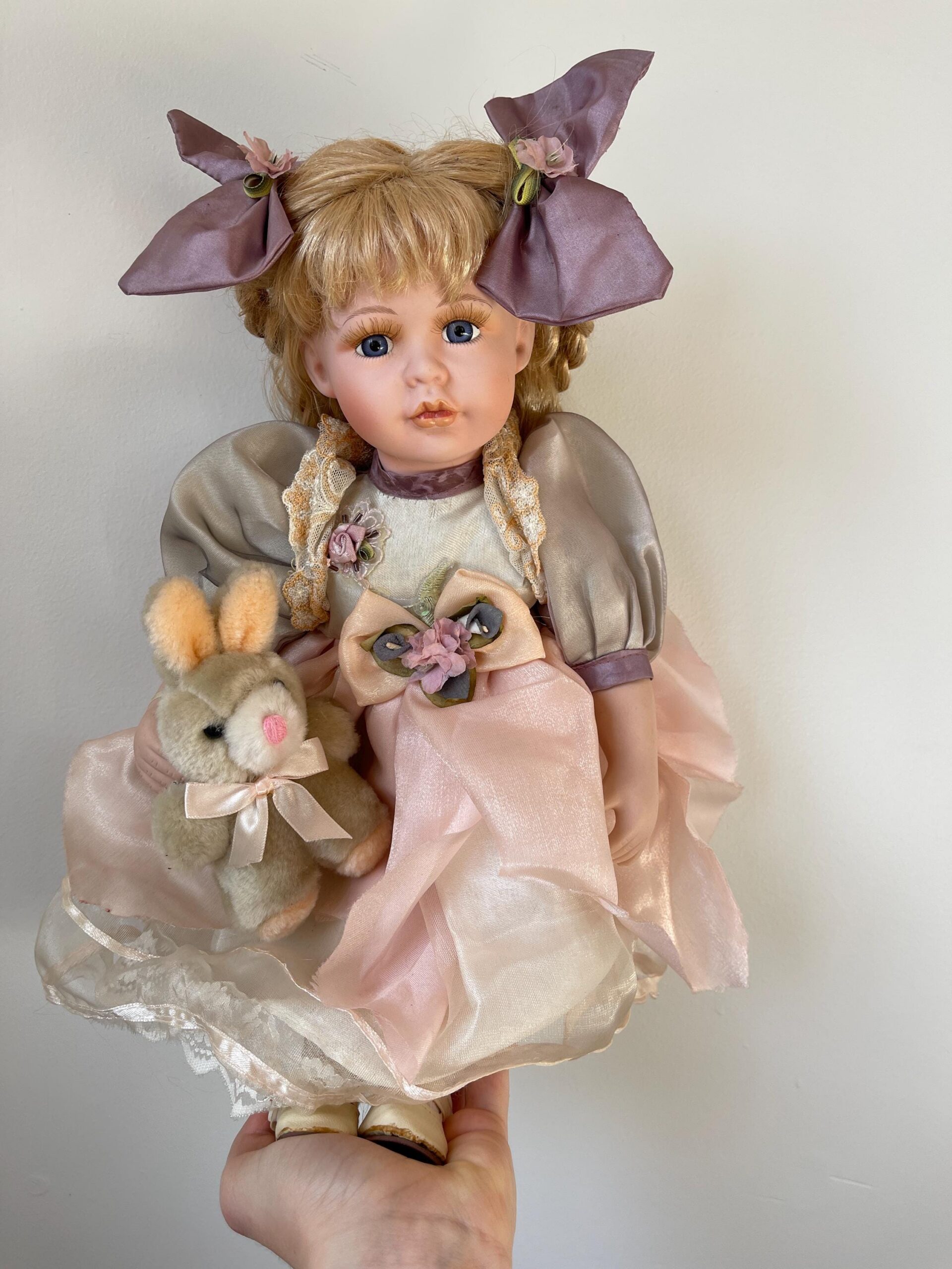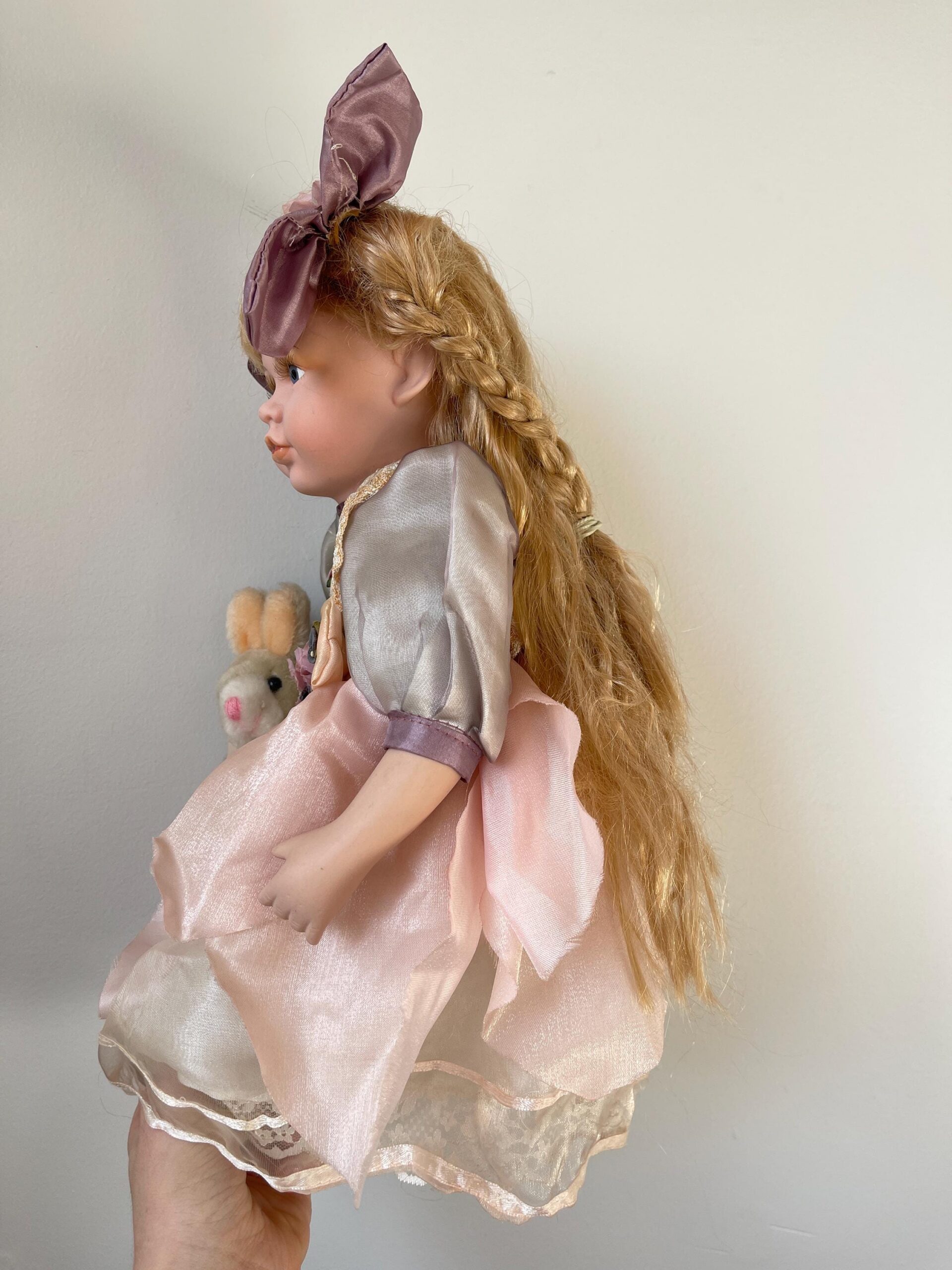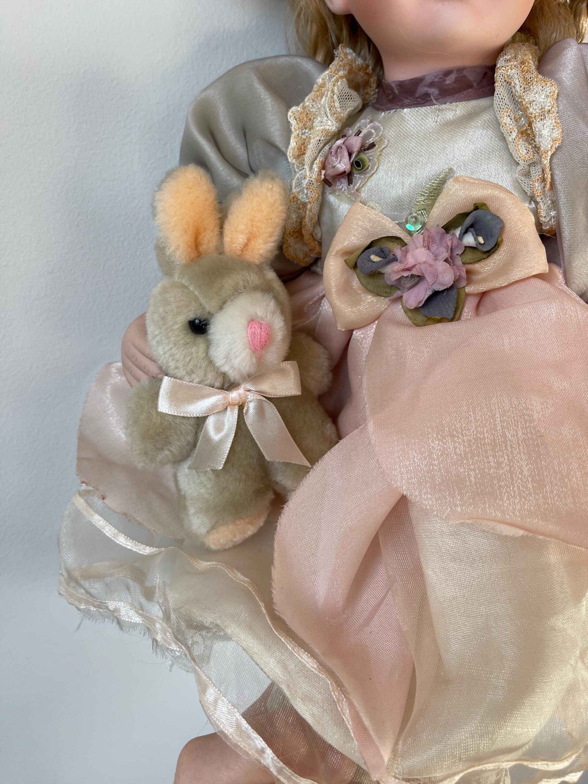 A charming 14-inch vintage porcelain doll dressed in a soft grey and pink dress with lace, flowers, and a matching companion rabbit.