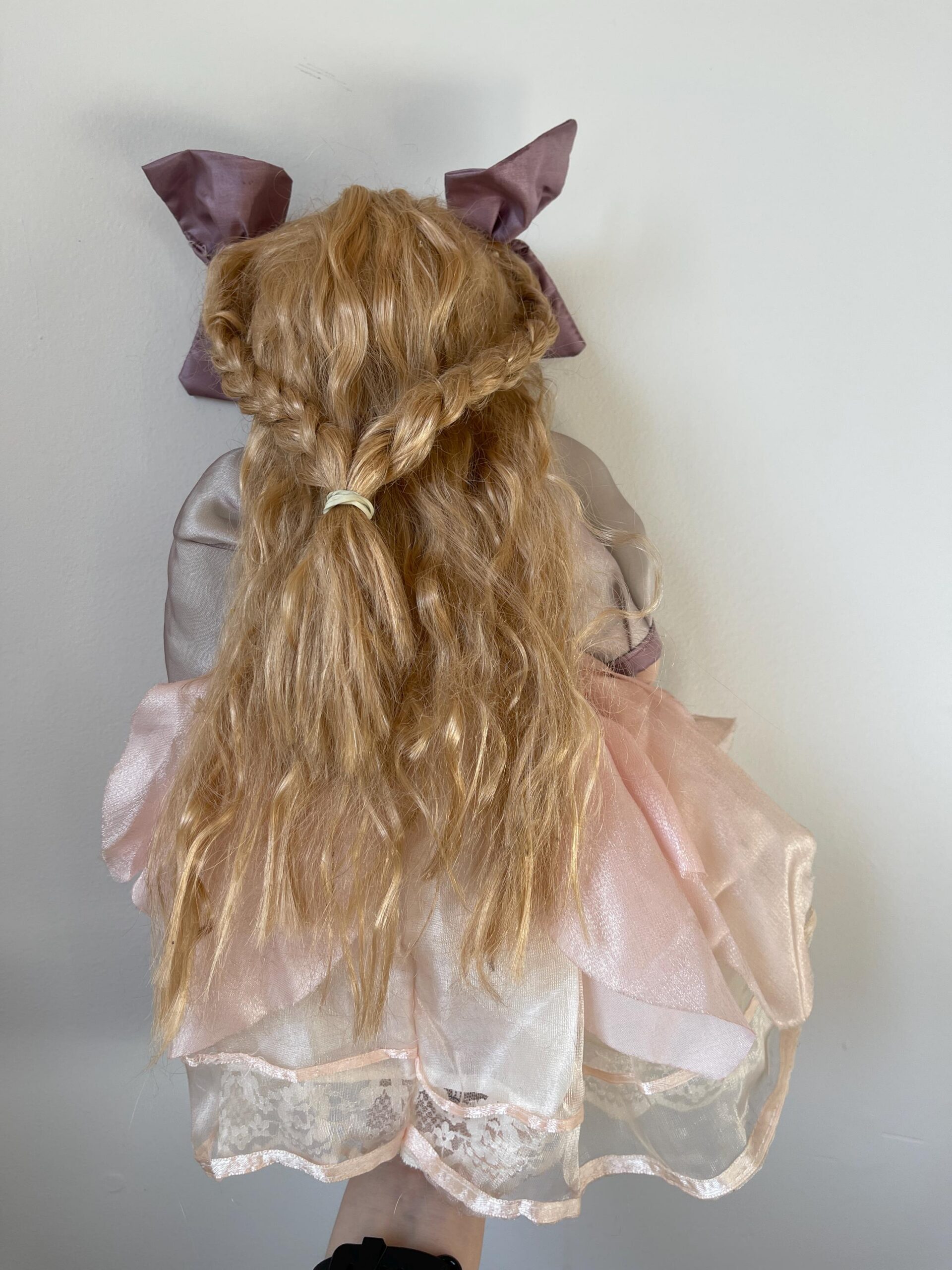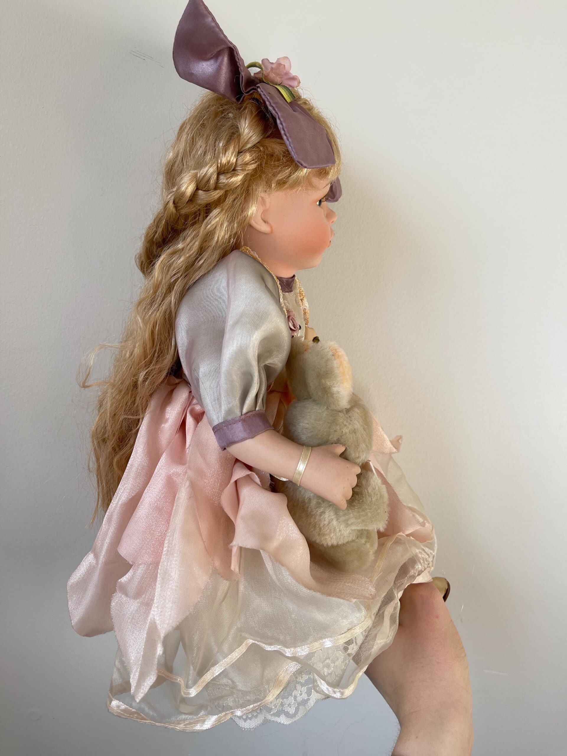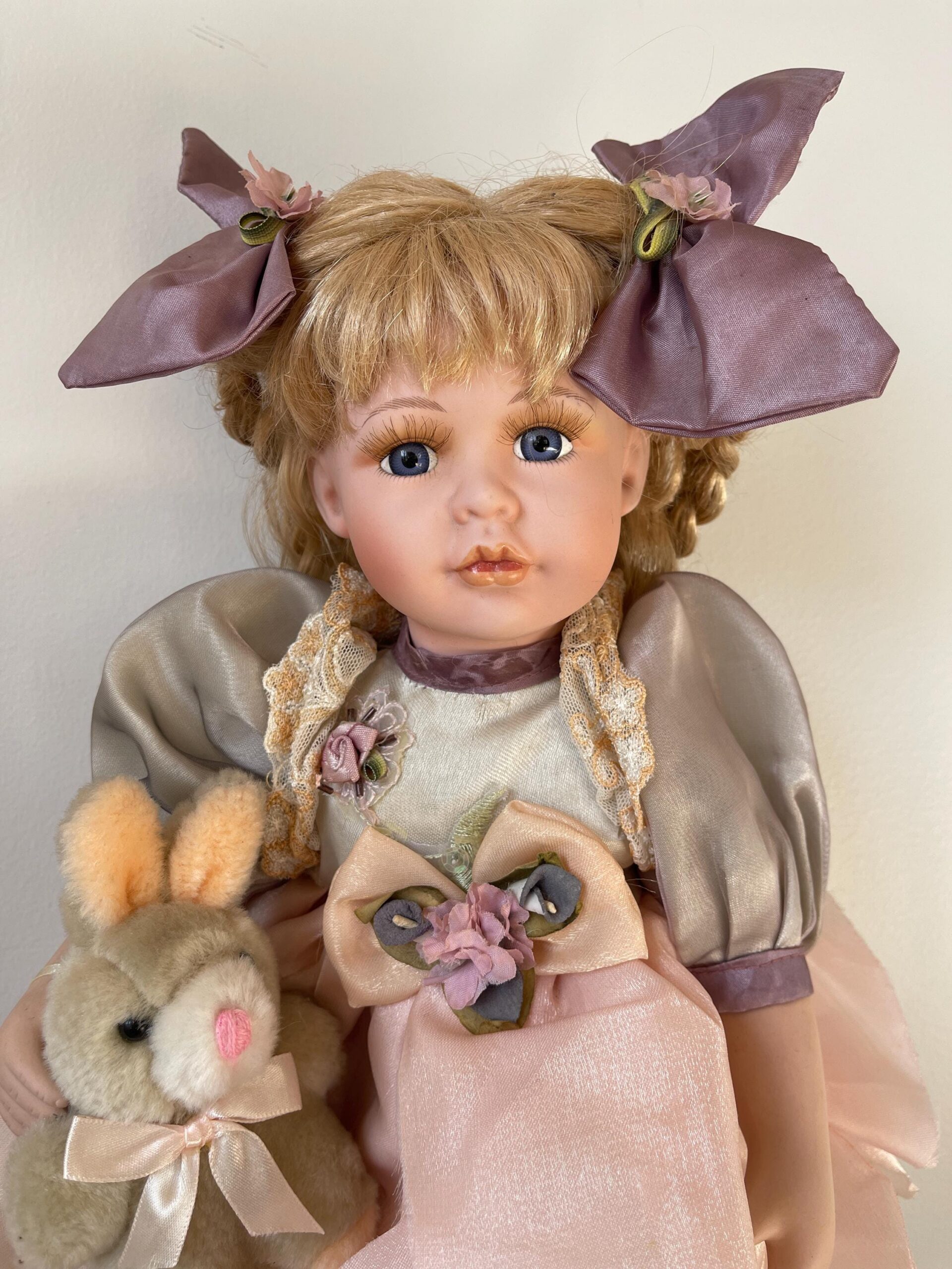 A charming 14-inch vintage porcelain doll dressed in a soft grey and pink dress with lace, flowers, and a matching companion rabbit.