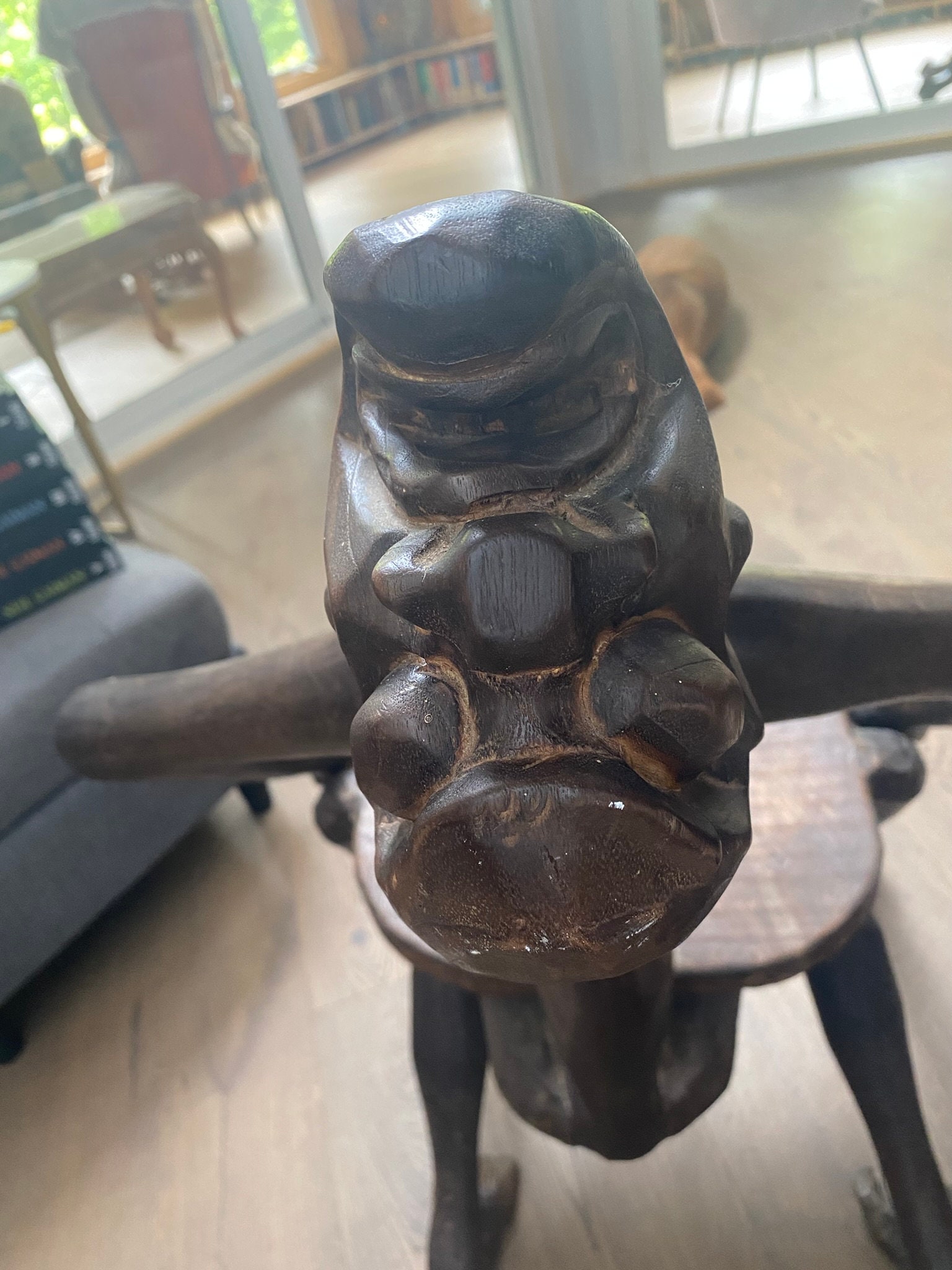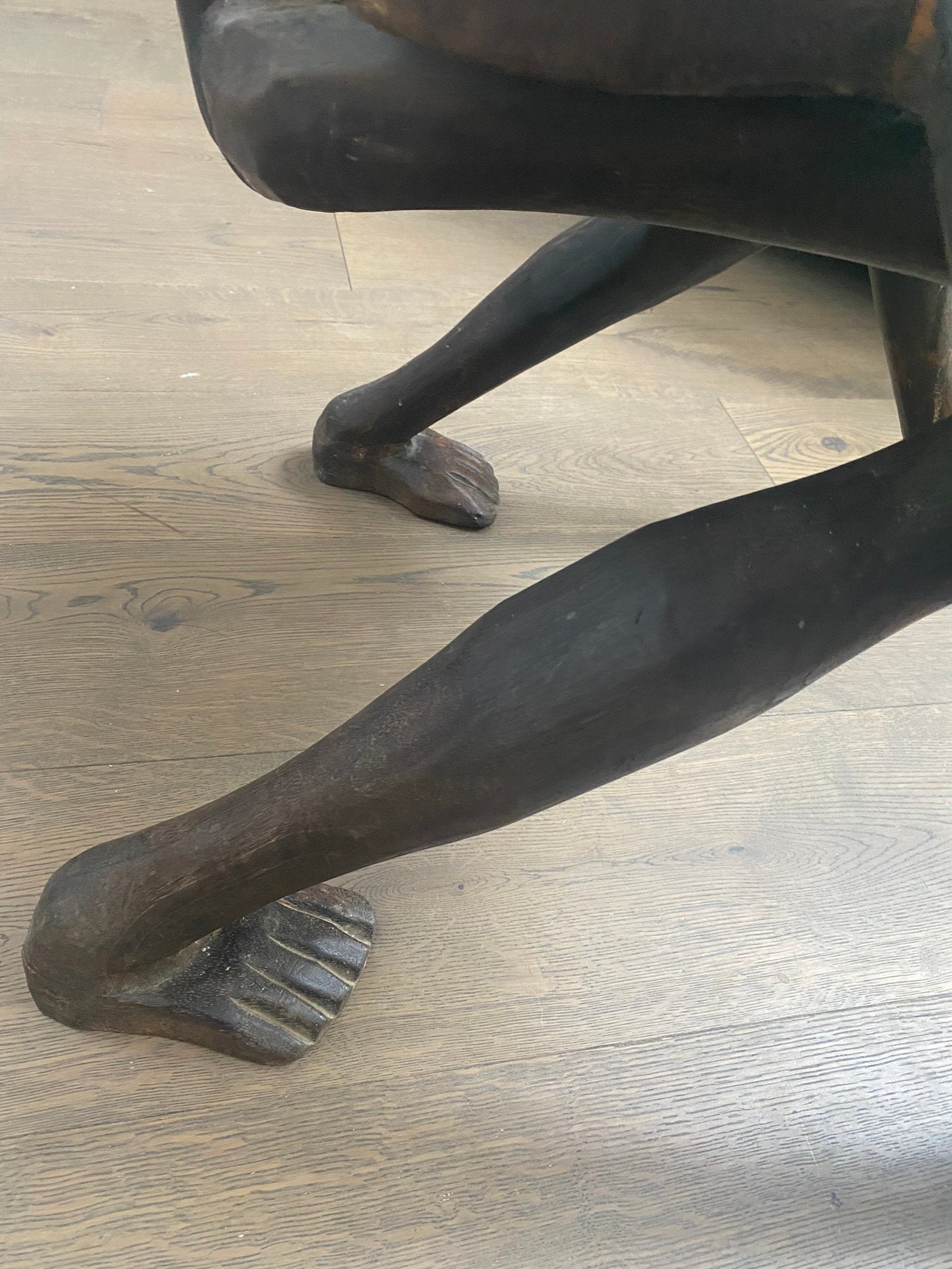 The craftsmanship is remarkable: every curve and contour has been painstakingly carved by hand, creating a piece that blurs the line between furniture and fine art. The dark wood has developed a rich patina over the years, adding depth and character.