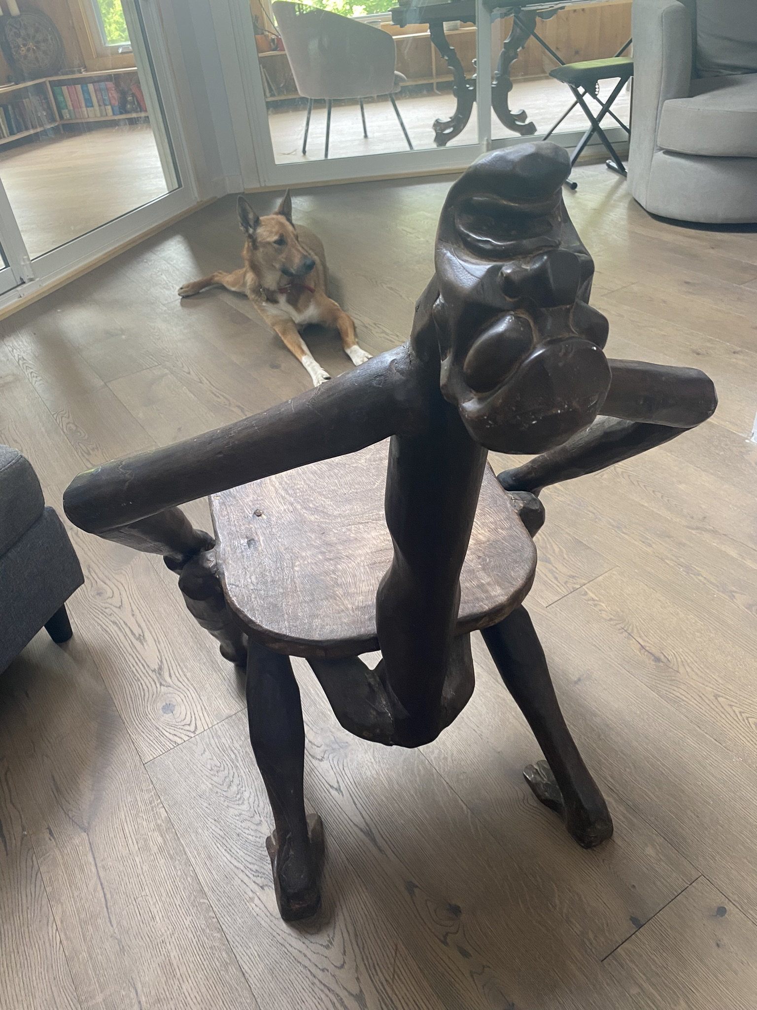 This extraordinary hand-carved chair is a stunning example of African surrealist folk art. Fashioned from dark tropical hardwood, it features an anthropomorphic figural form — a human-like shape that serves as both sculpture and functional seating.