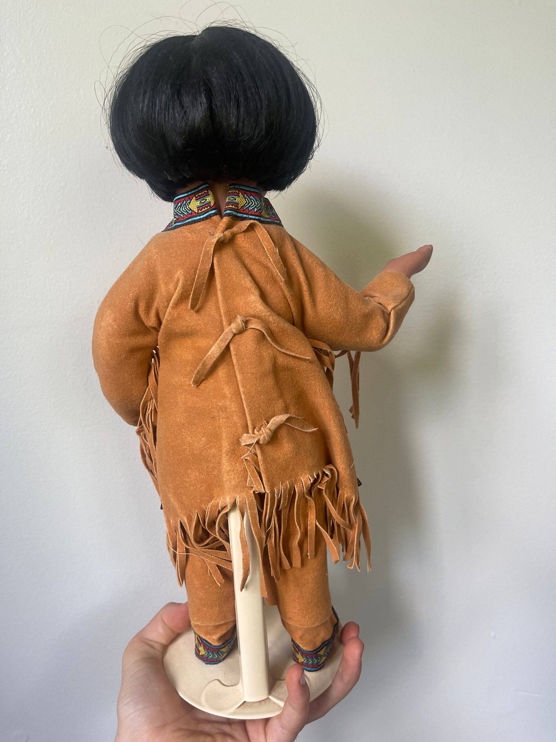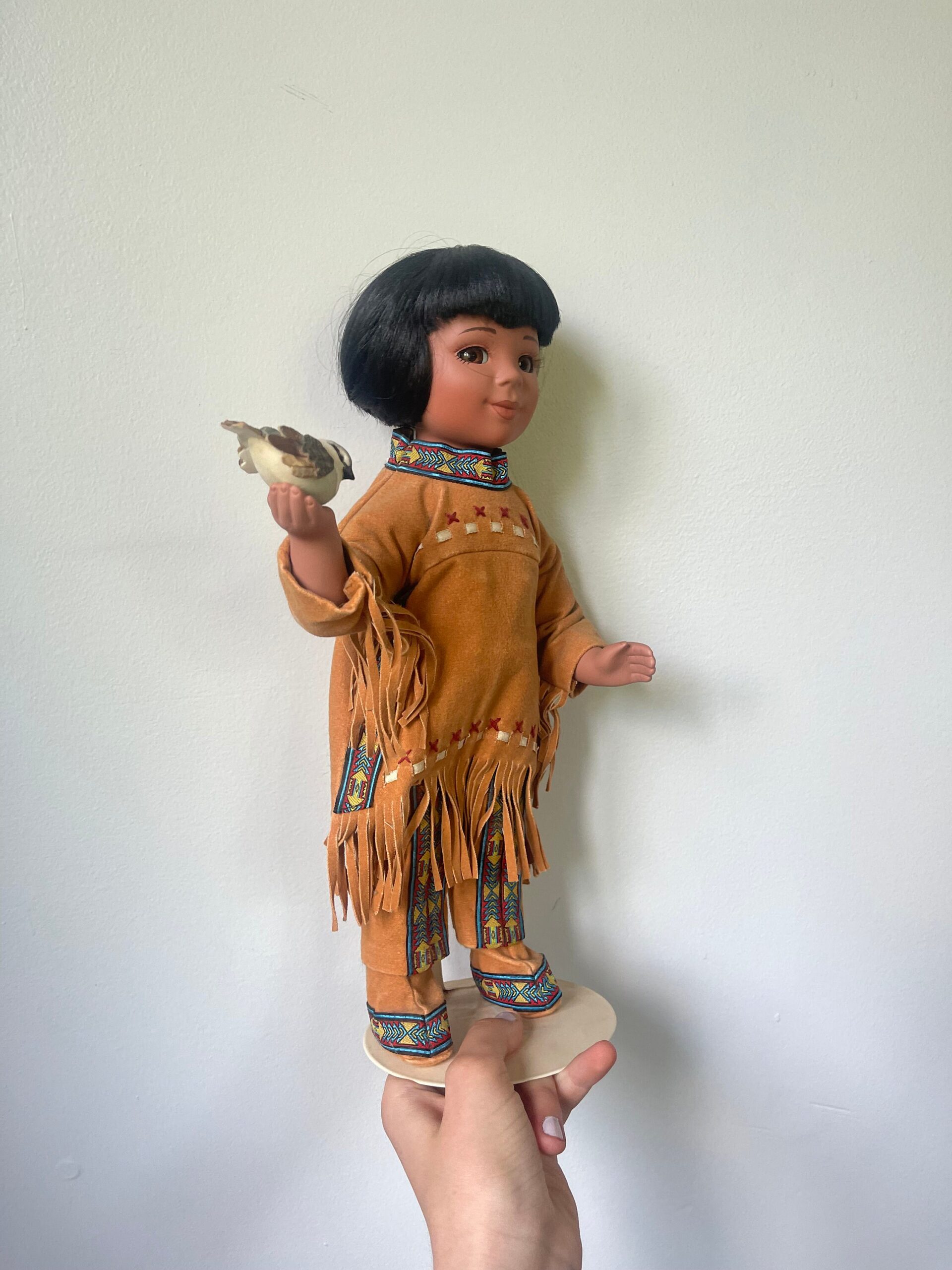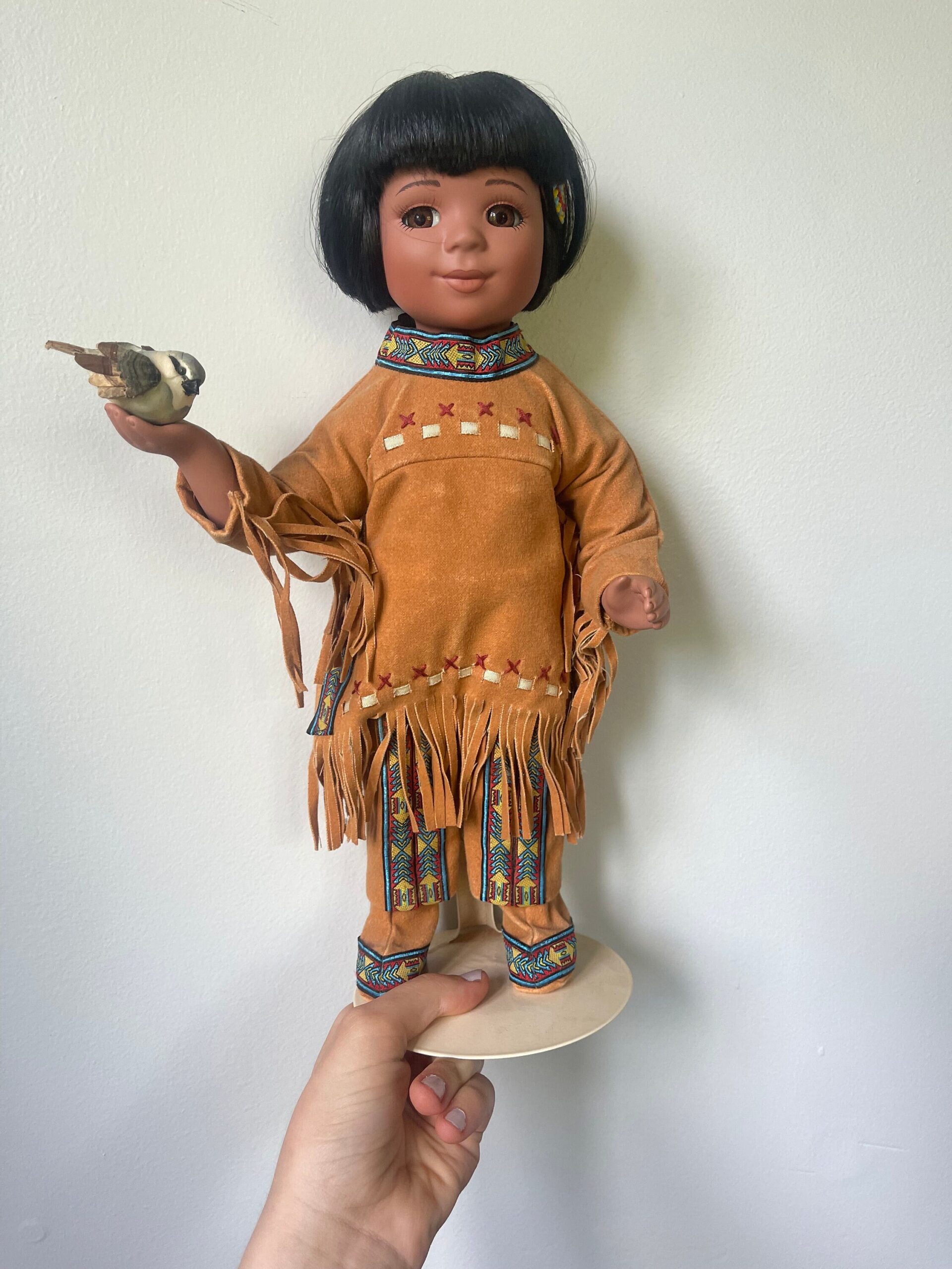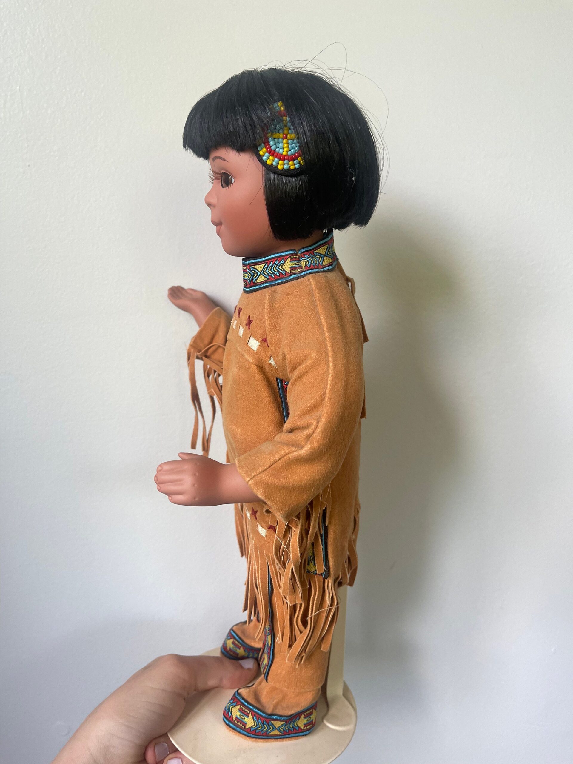 A 16-inch vintage porcelain doll in a lovely lavender floral dress. Soft colors and gentle styling create a classic collectible look.