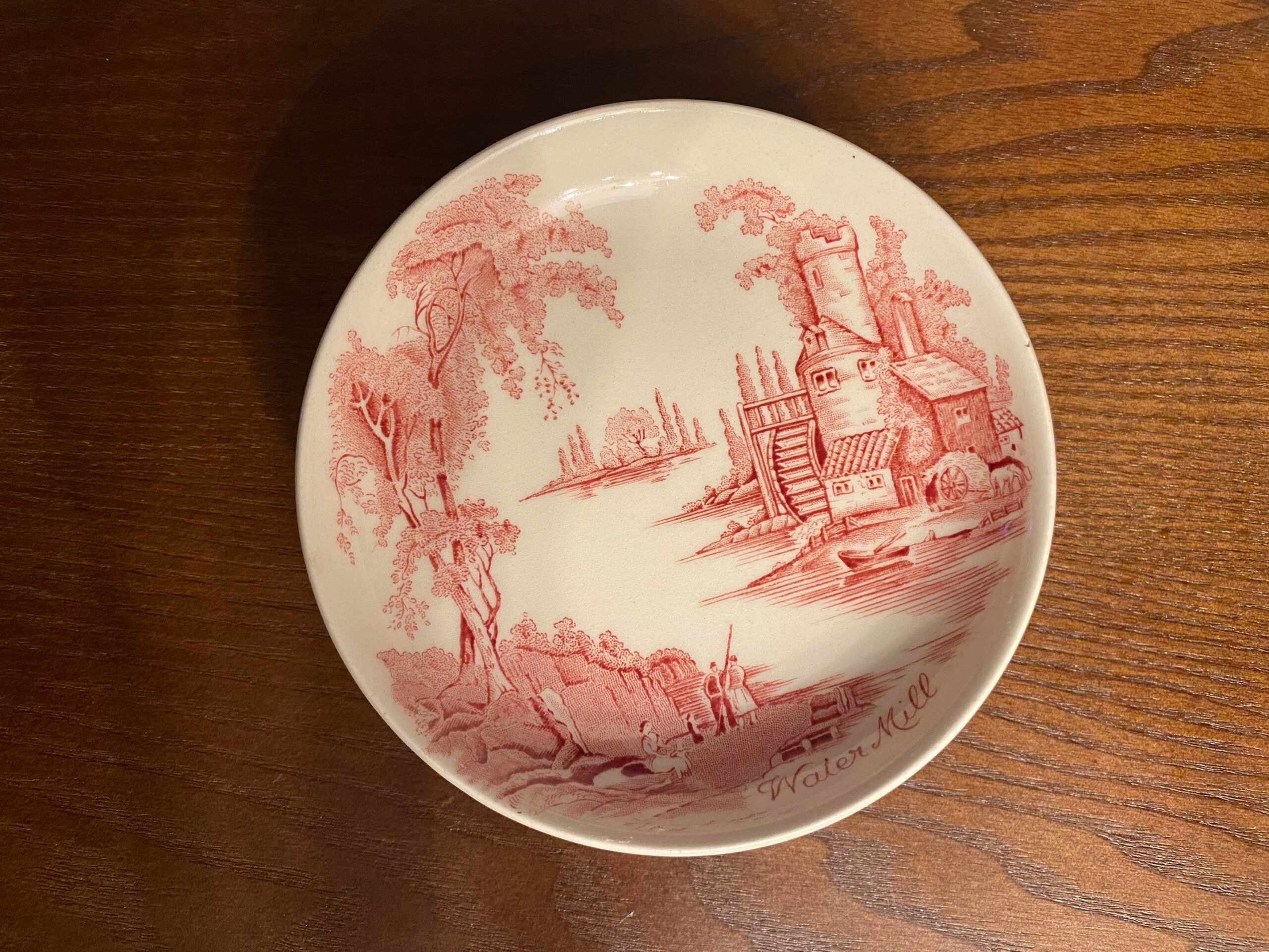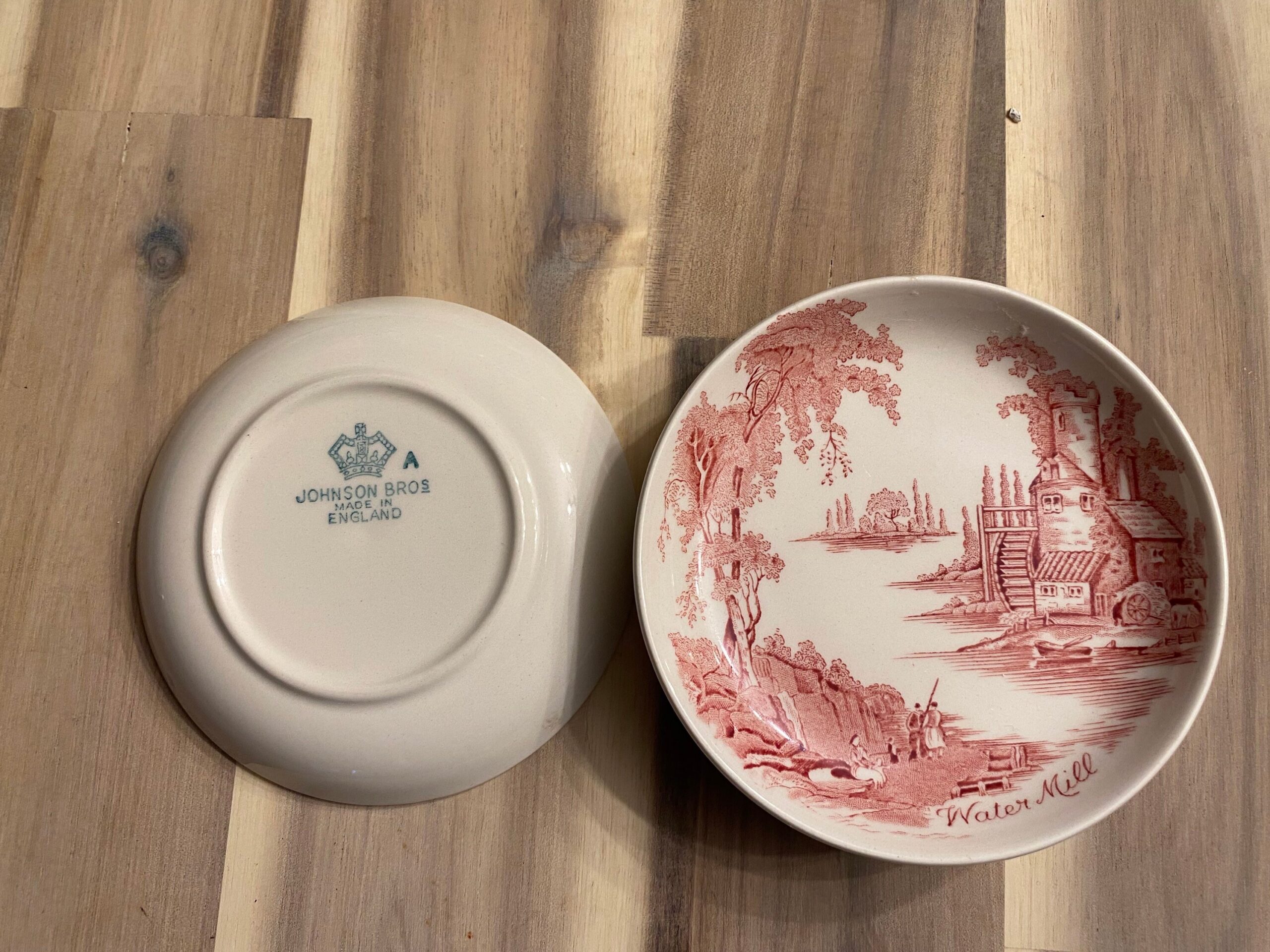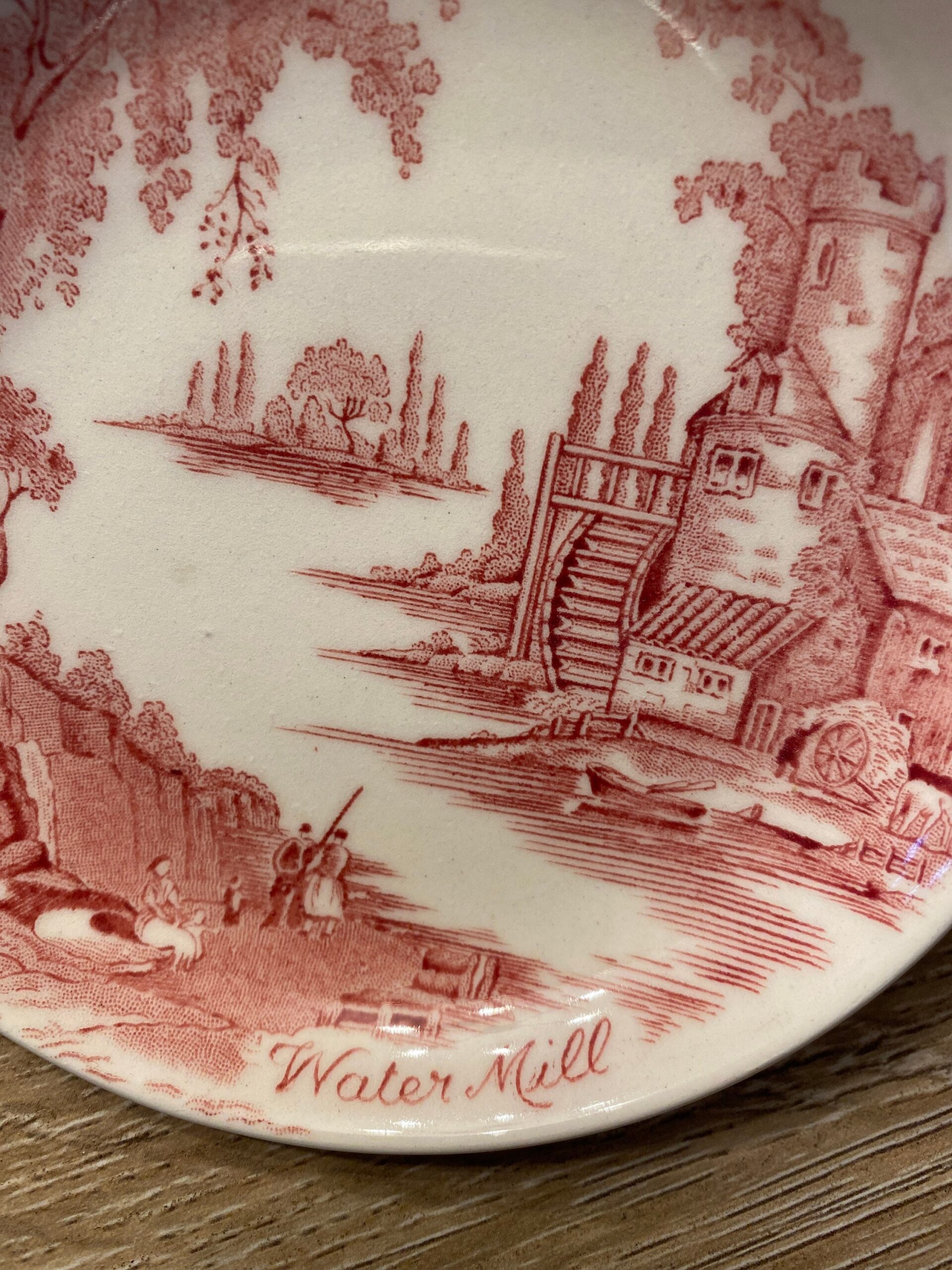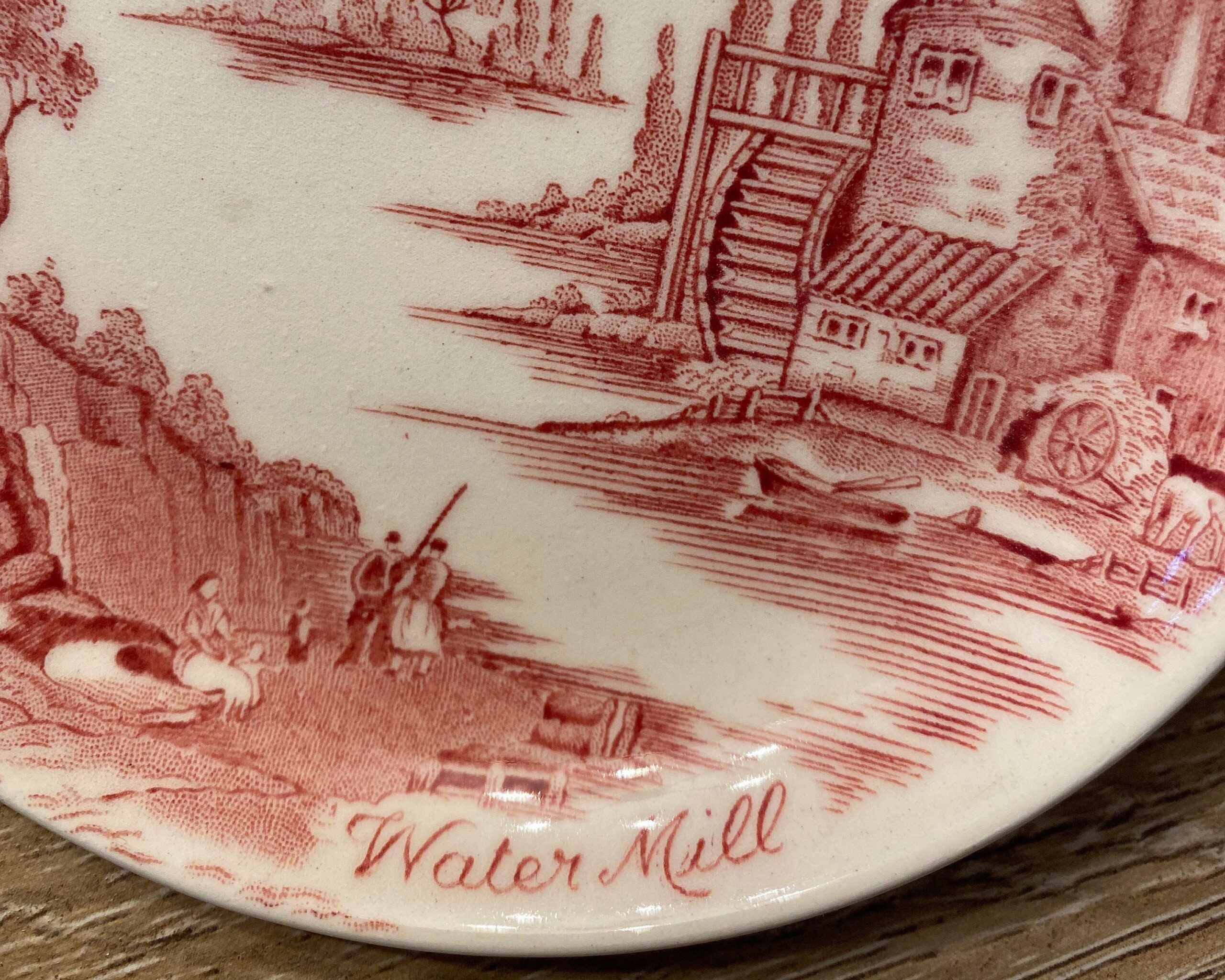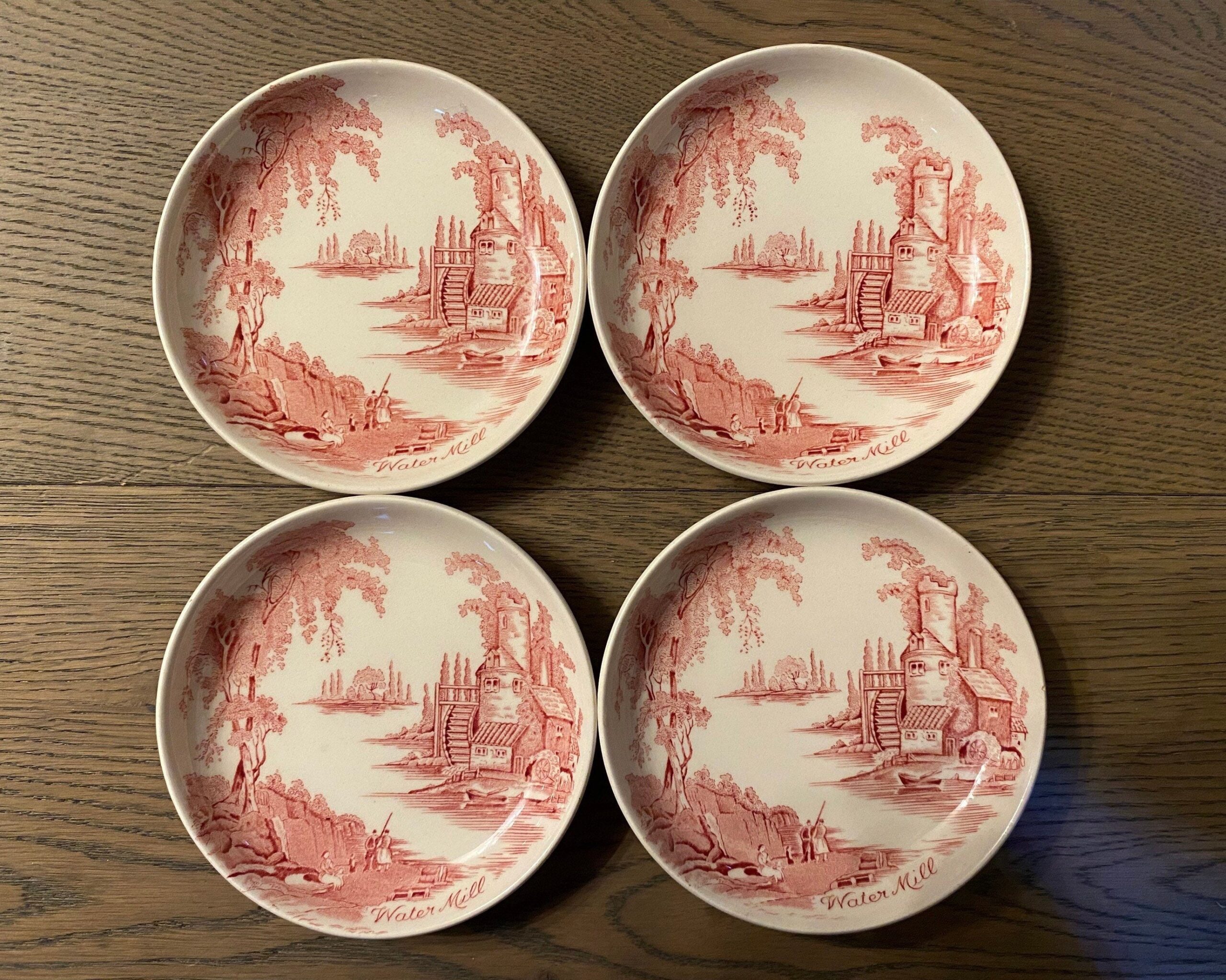 This delightful set of four miniature plates is by the renowned English pottery house Johnson Brothers, in the charming "Watermill" pattern. Each plate measures approximately 4.2 inches in diameter, featuring a detailed pastoral scene of a traditional English watermill.