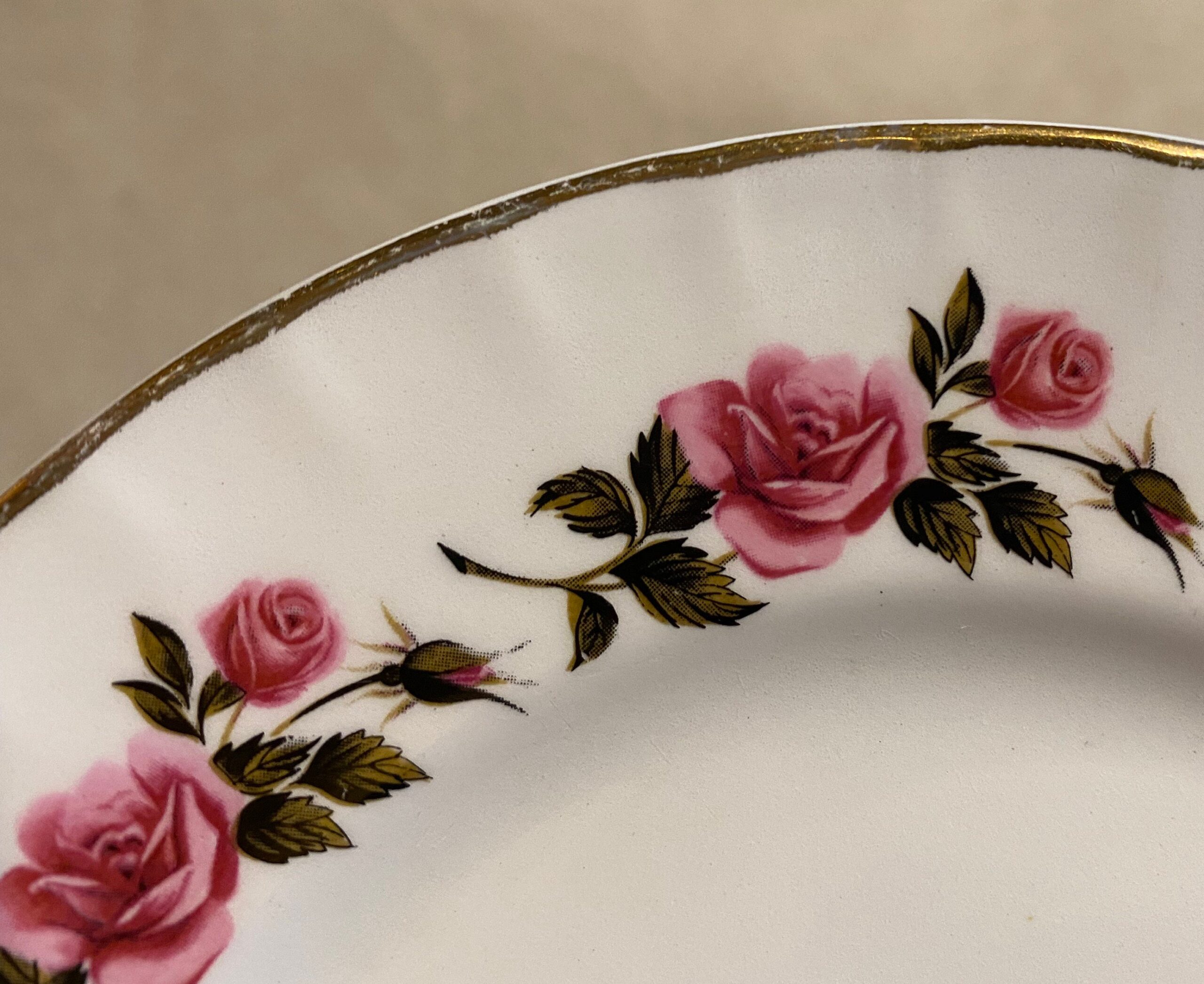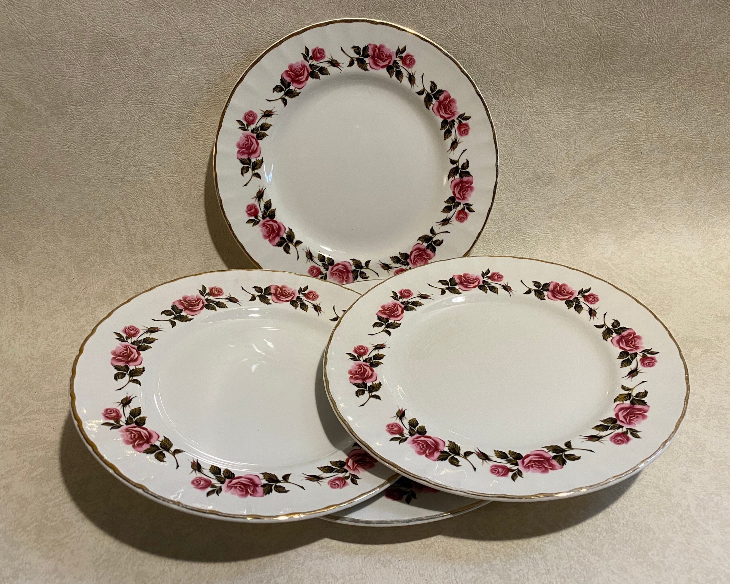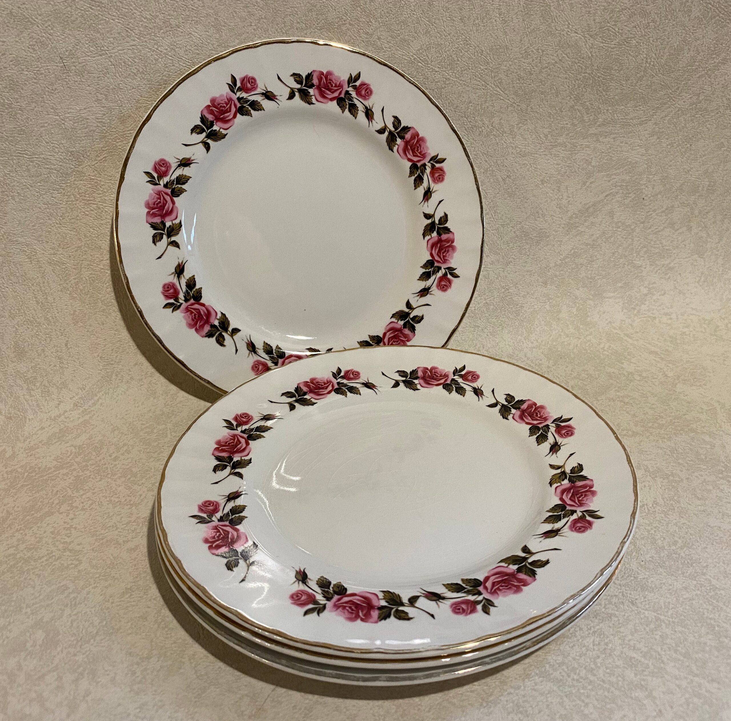 A lovely set of four vintage ceramic plates by Ridgeway (Staffordshire, England) in the “Romance” pattern, with warranted 22-karat gold decoration.
