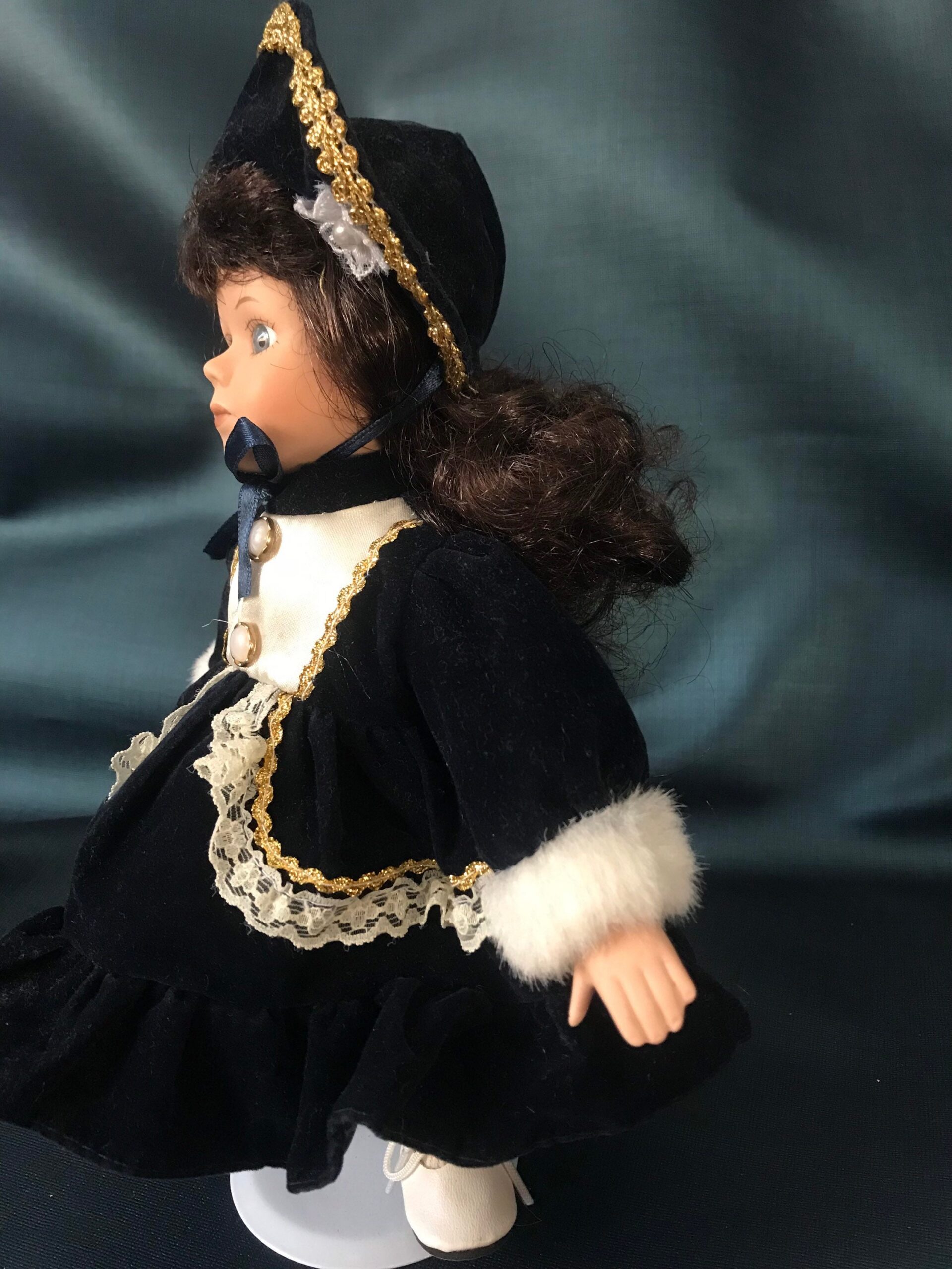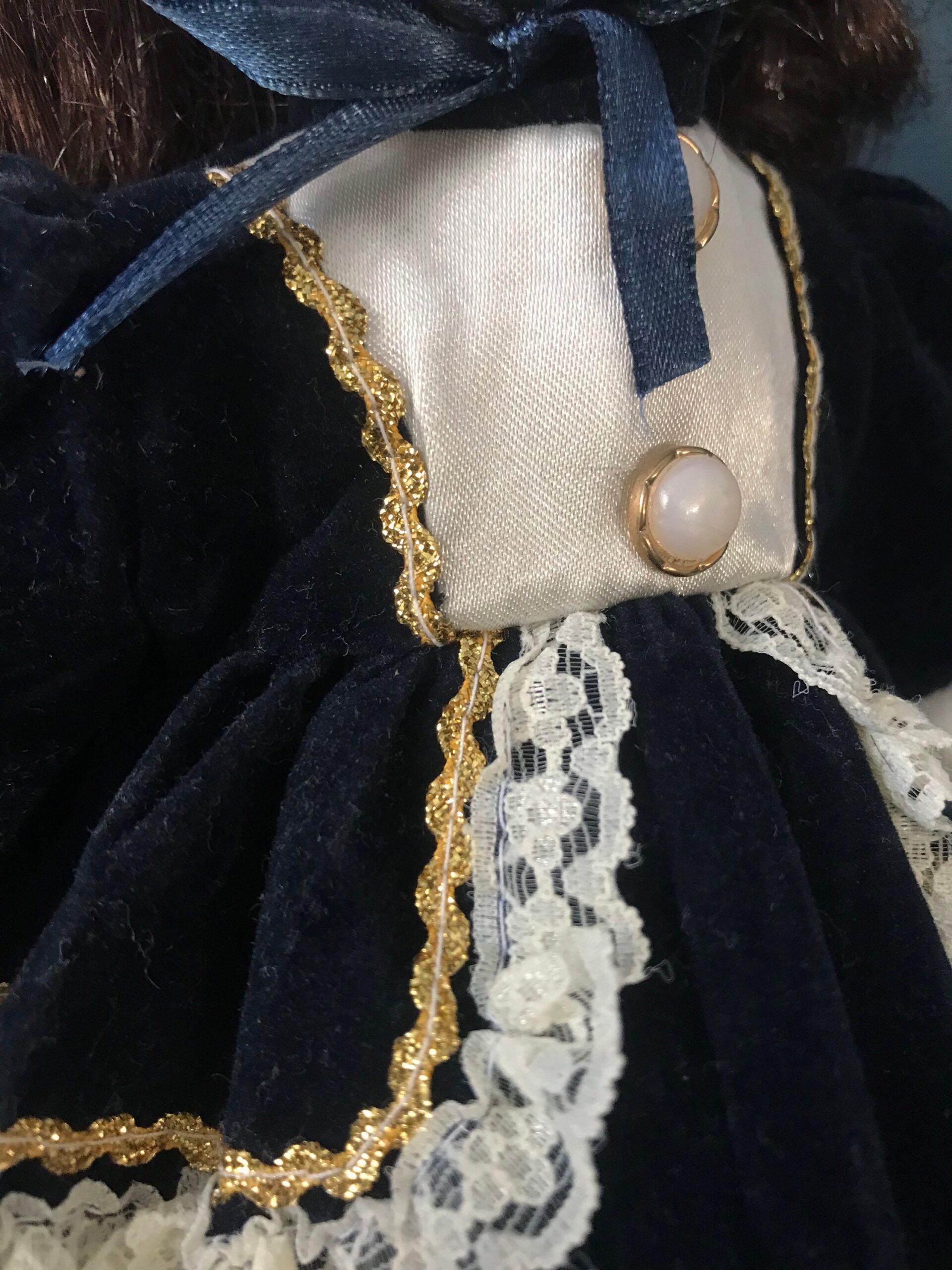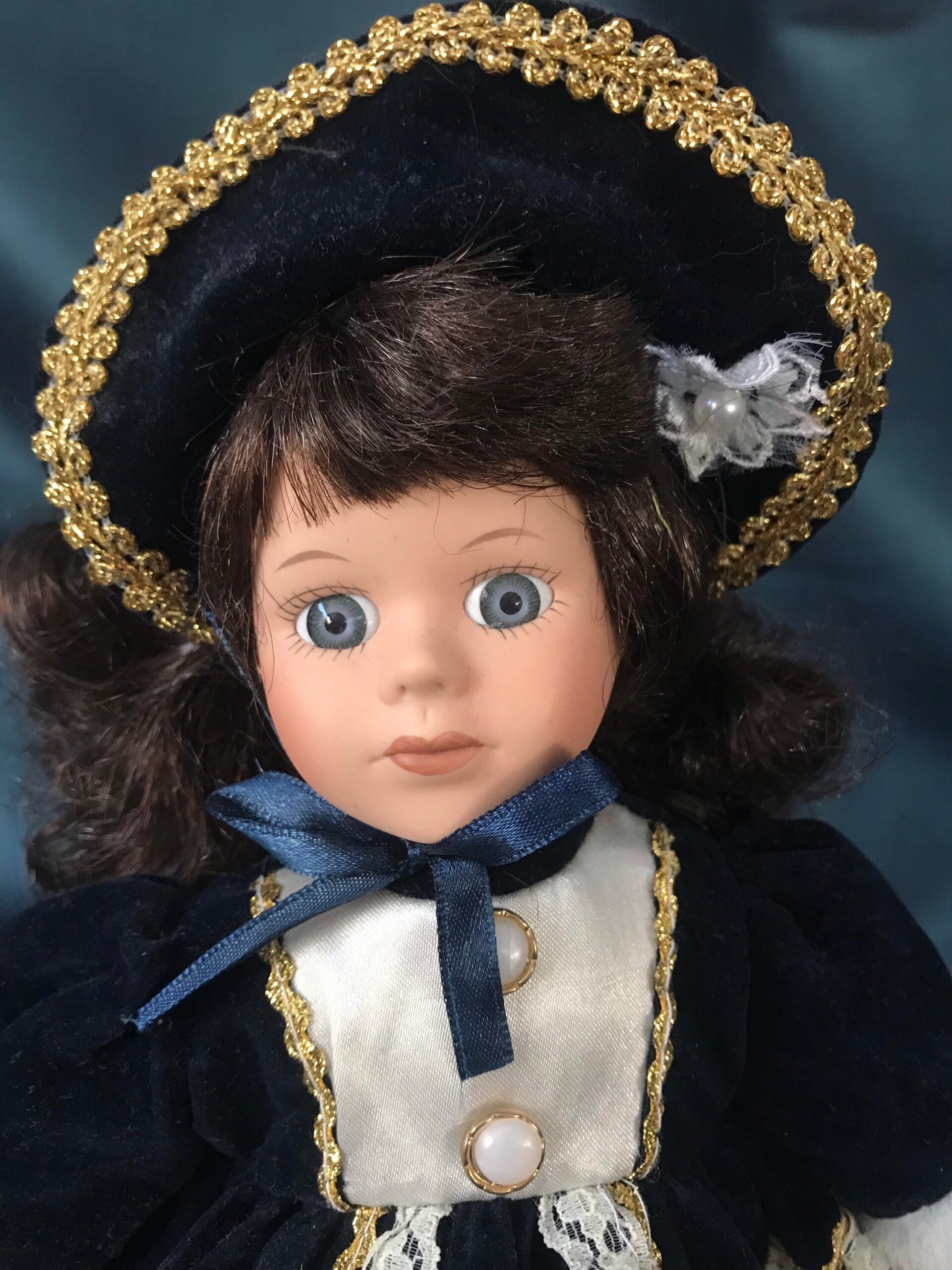 A striking 16-inch vintage porcelain doll in a rich red velvet dress. Luxurious styling with hand-painted porcelain features.