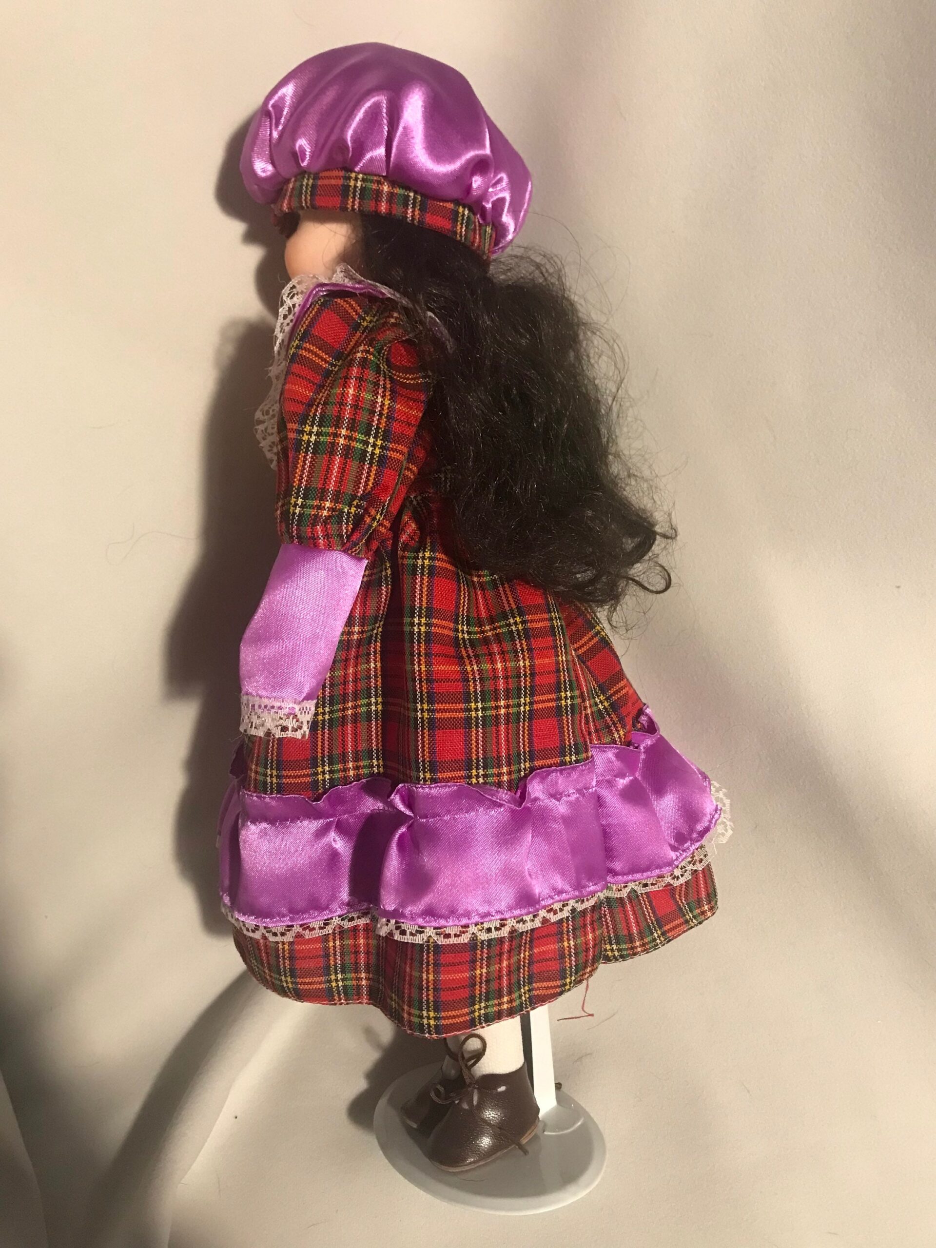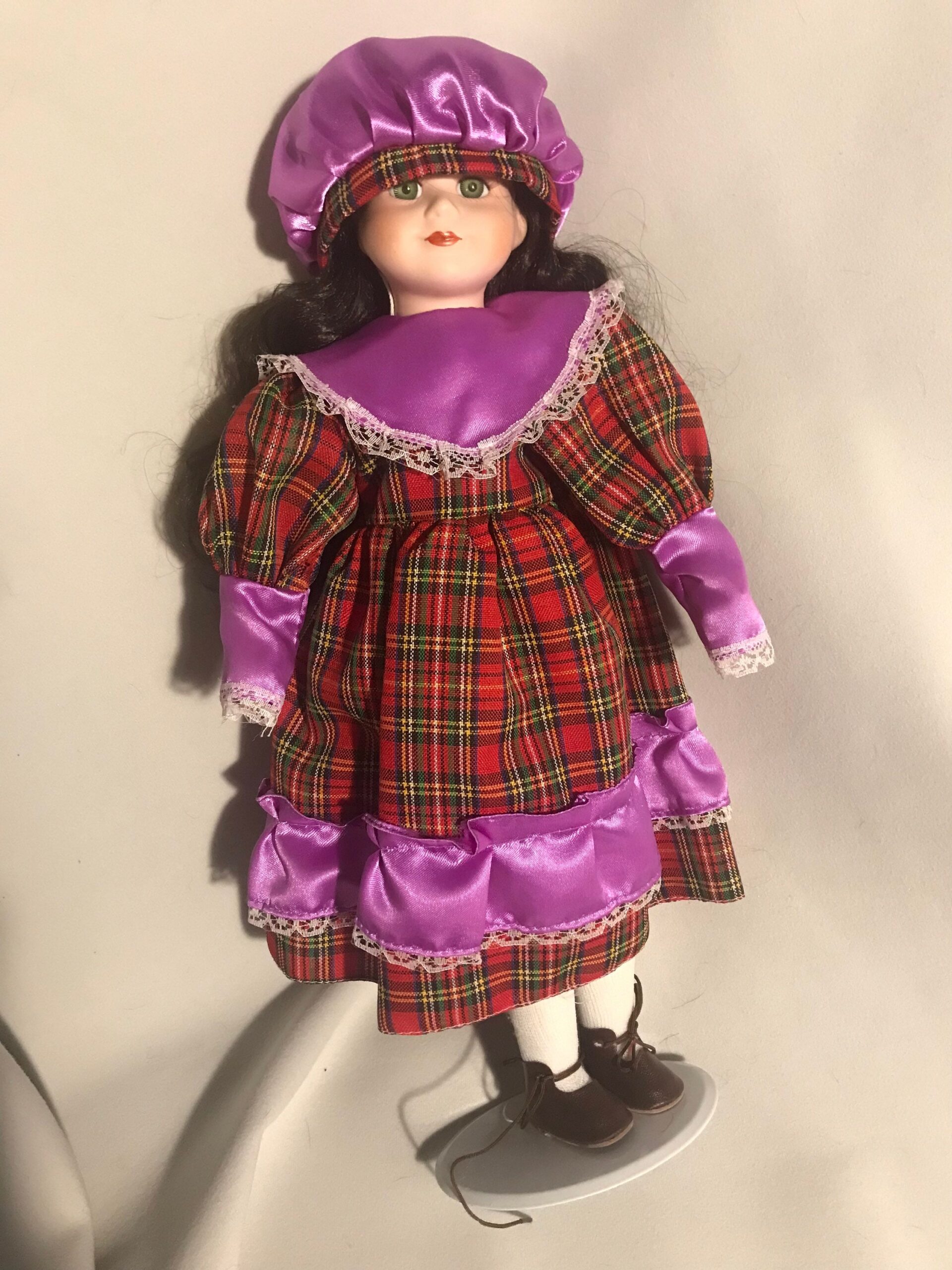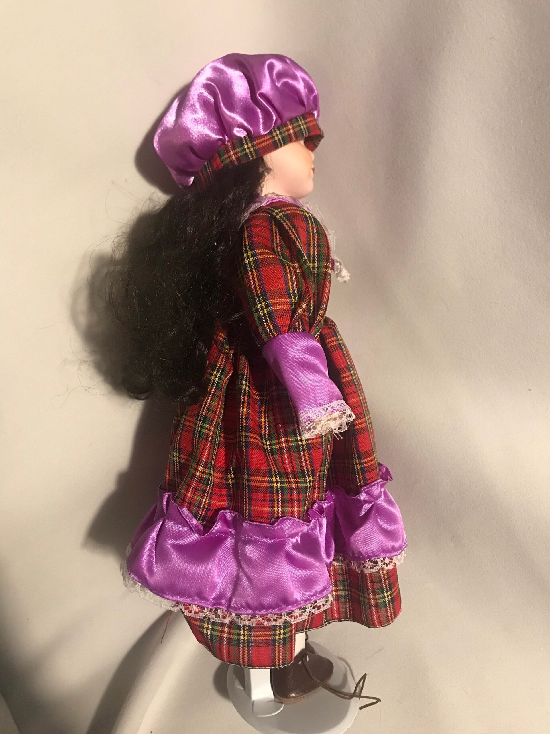 A striking 16-inch vintage porcelain doll wearing a plaid and purple dress. Beautifully hand-painted features with elegant styling.