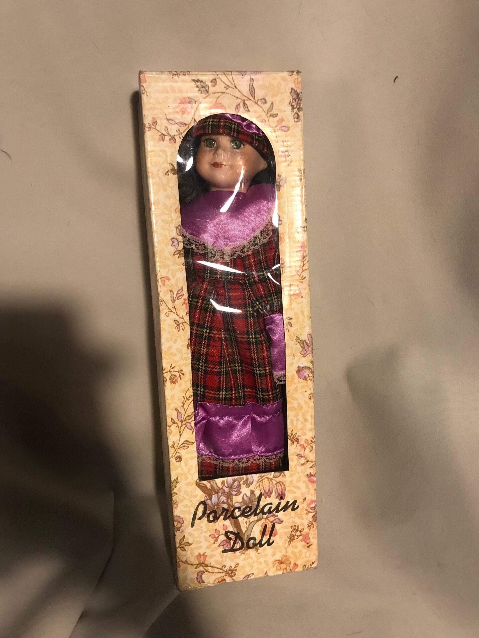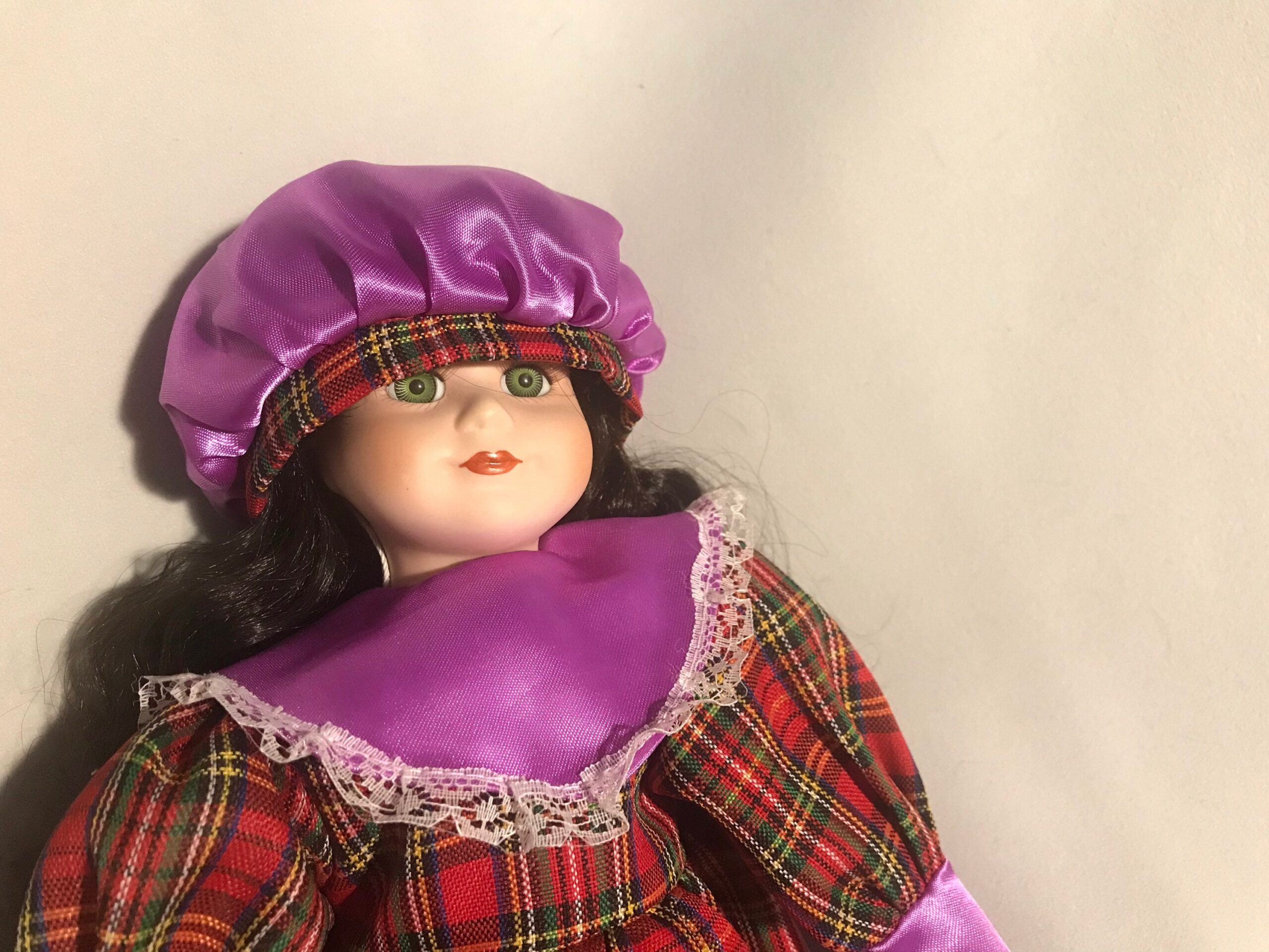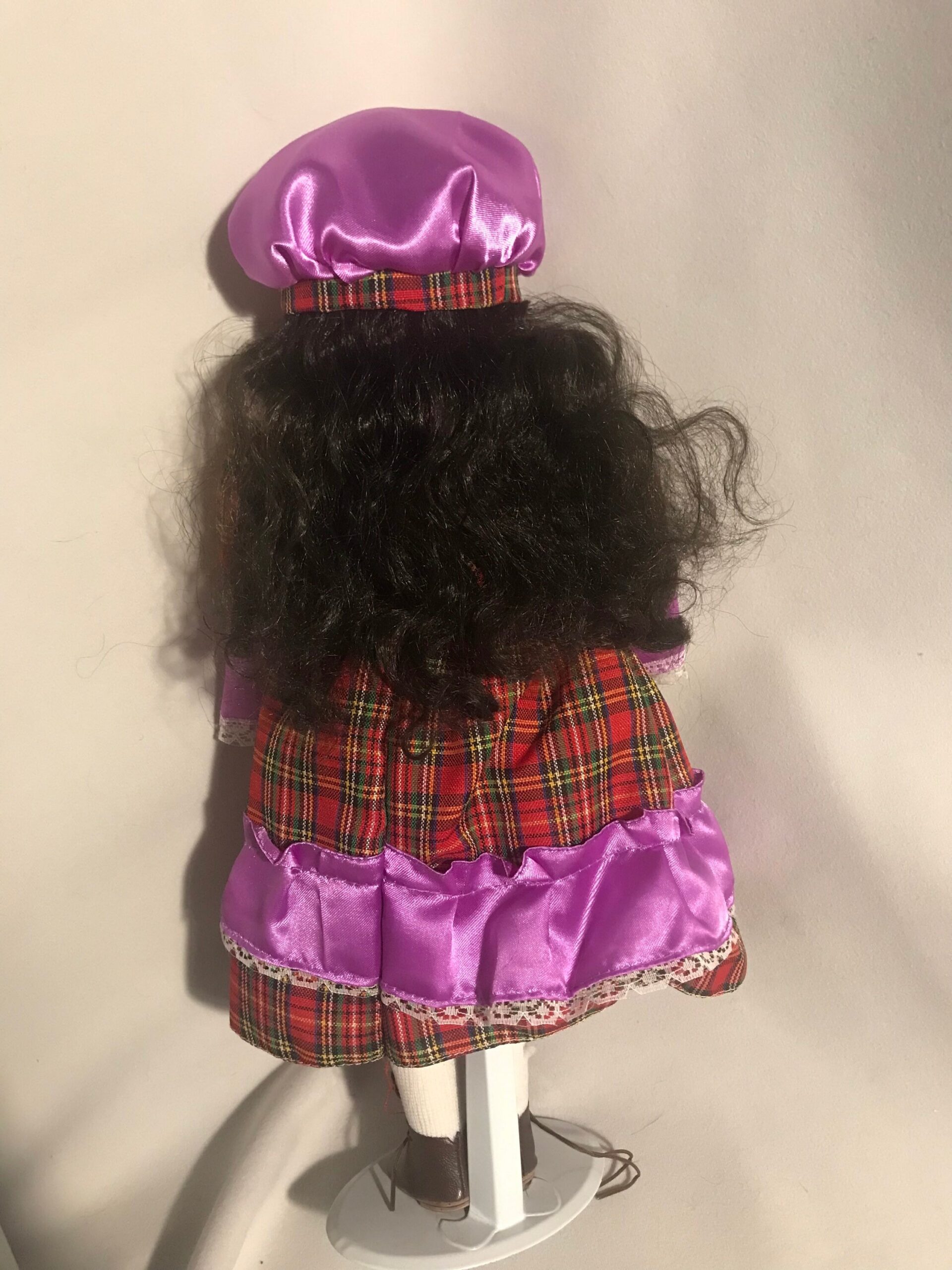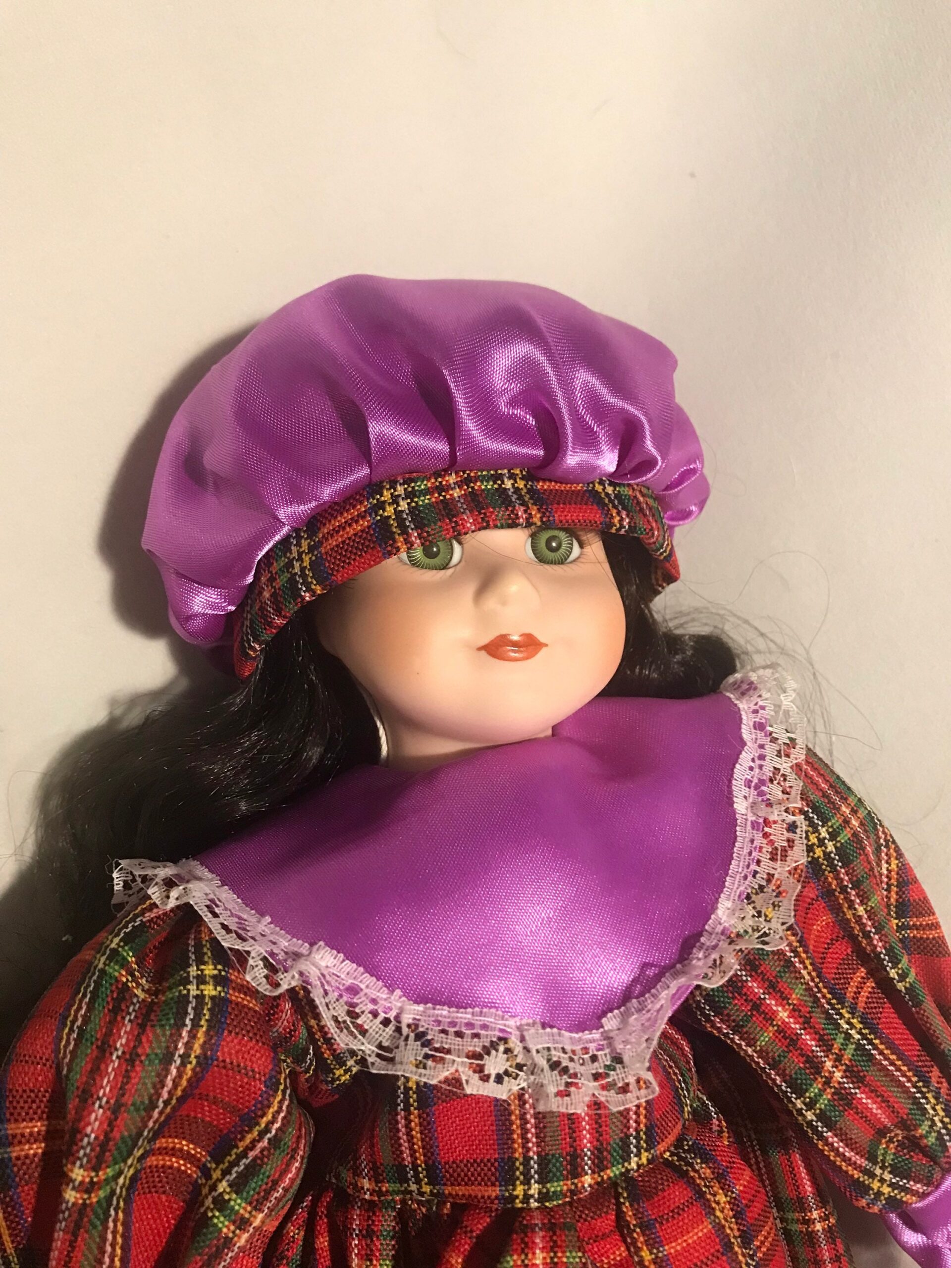 A striking 16-inch vintage porcelain doll wearing a plaid and purple dress. Beautifully hand-painted features with elegant styling.