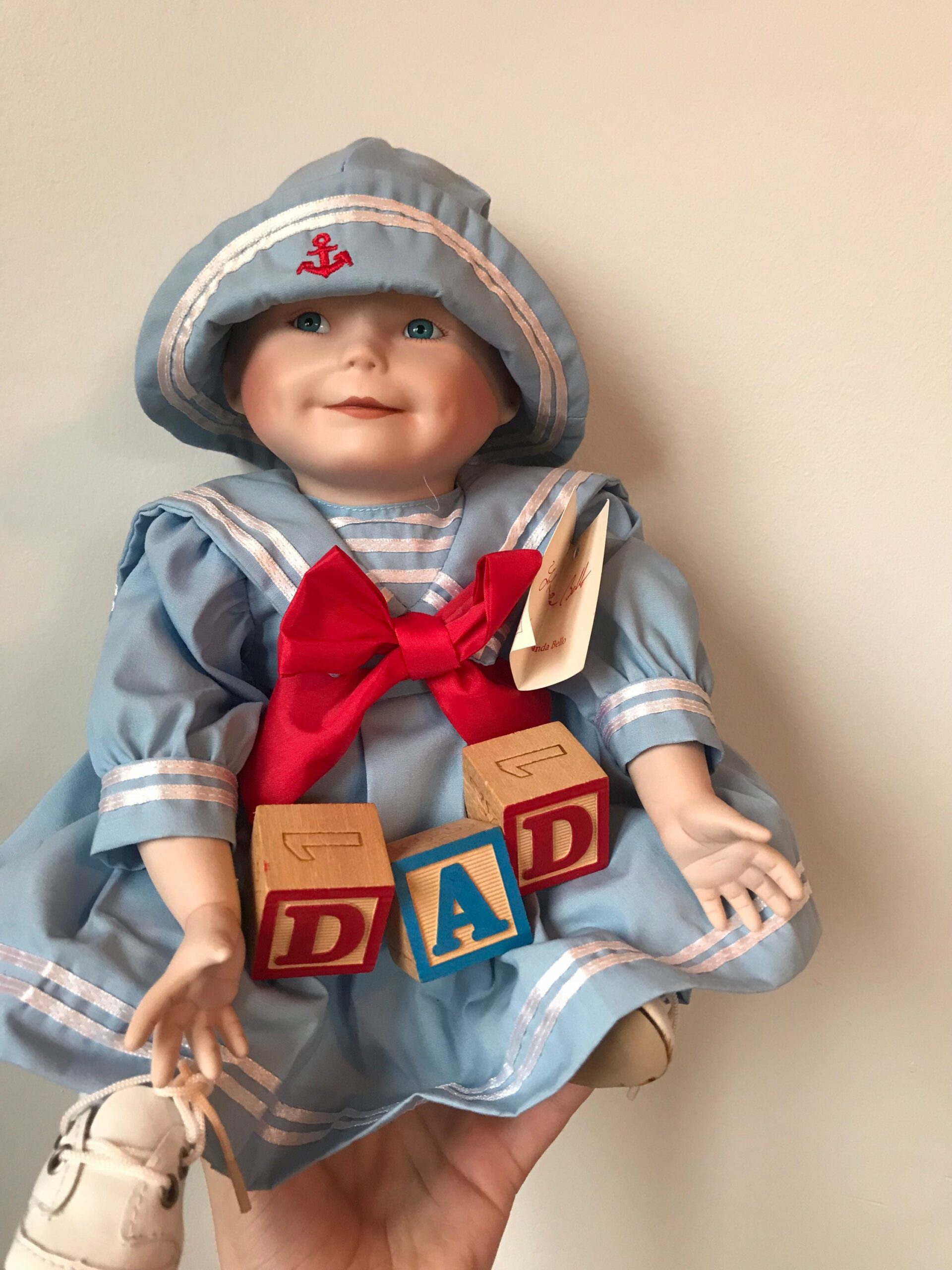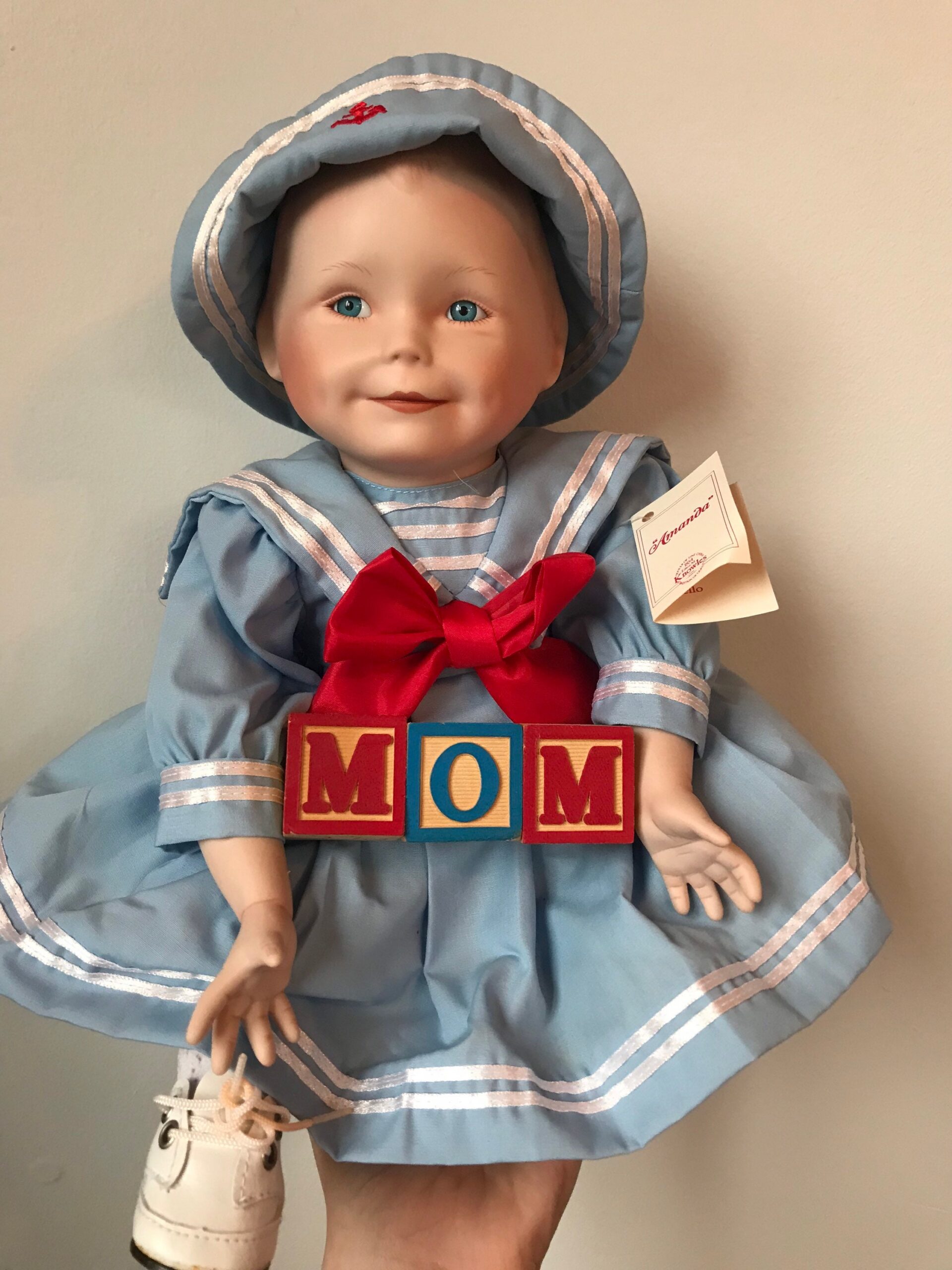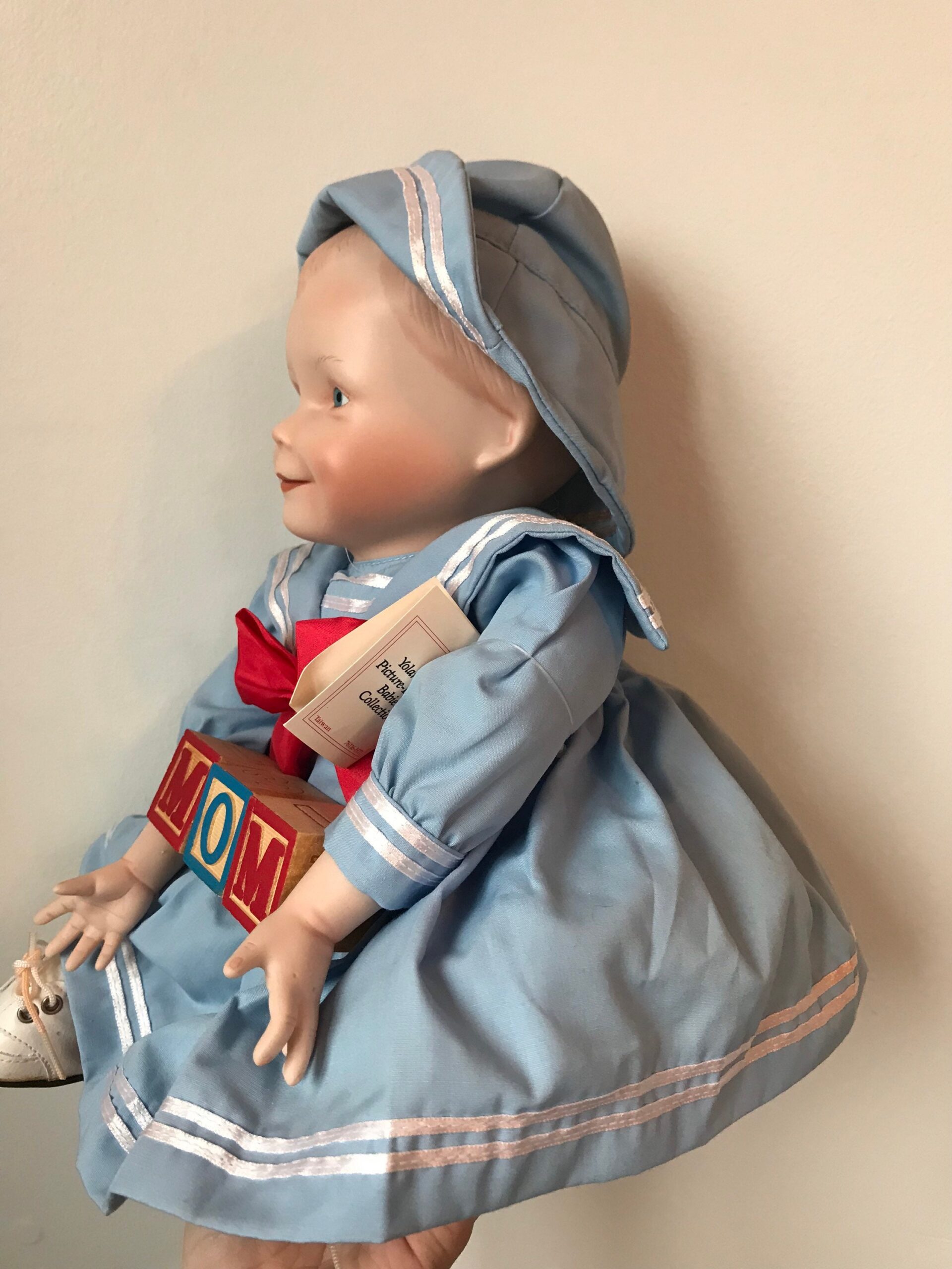 A 16-inch vintage porcelain doll in an elegant ivory lace gown. Bridal-inspired styling with refined craftsmanship.