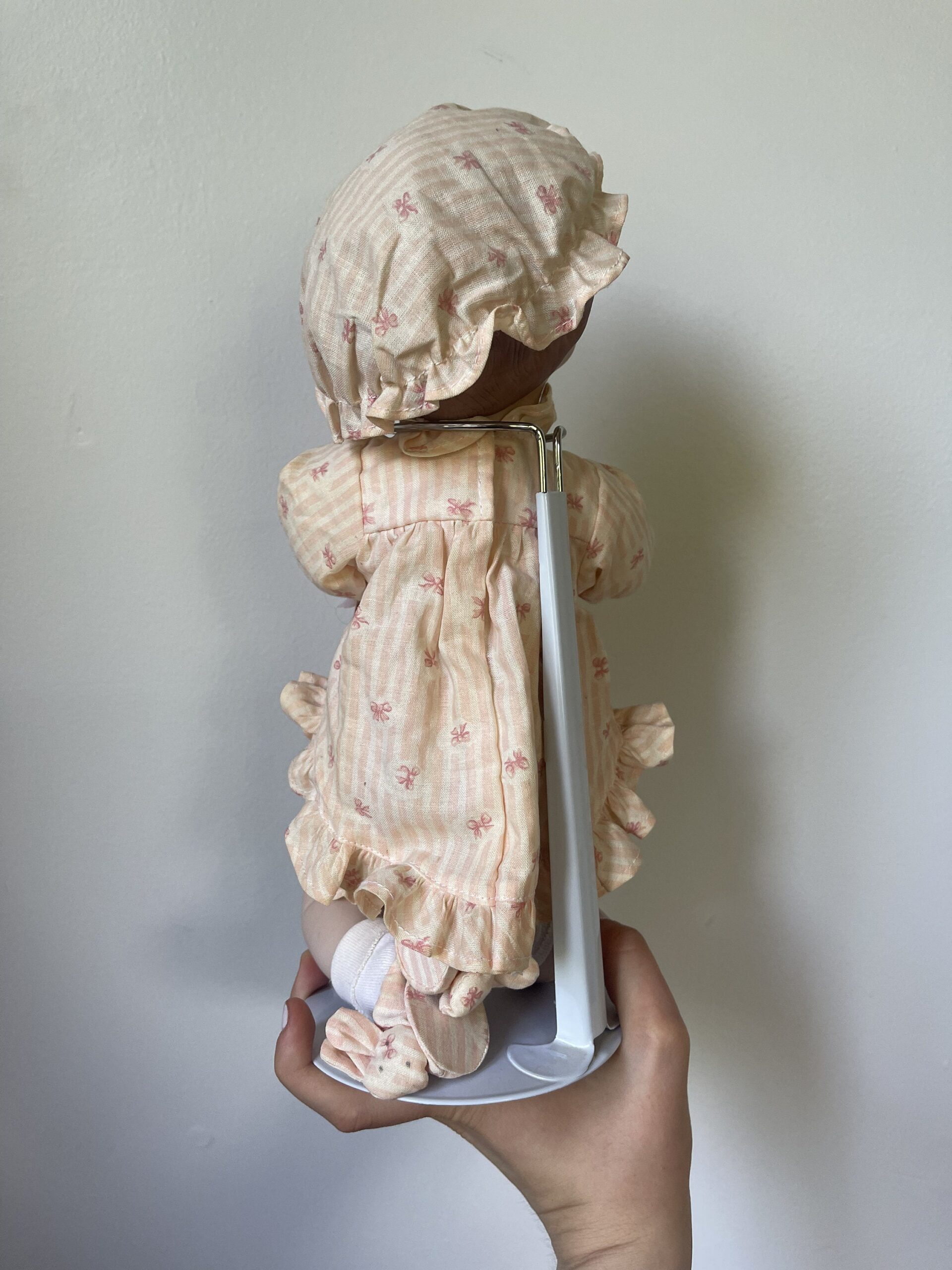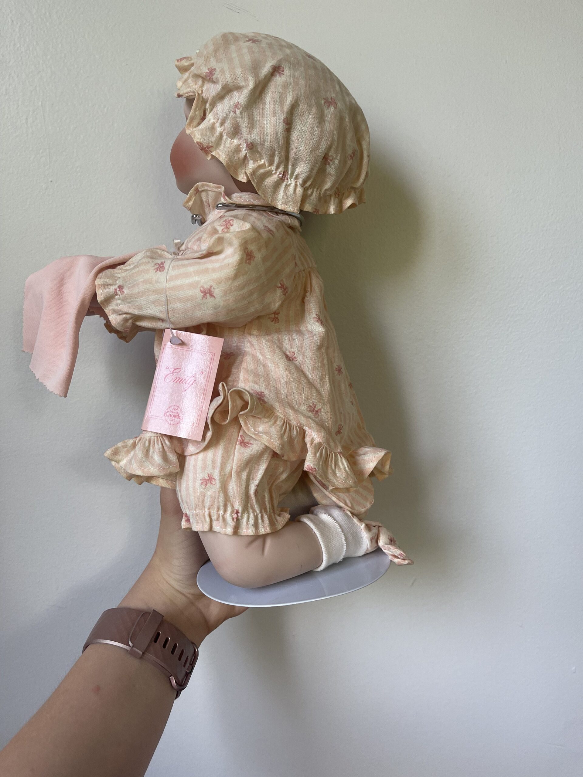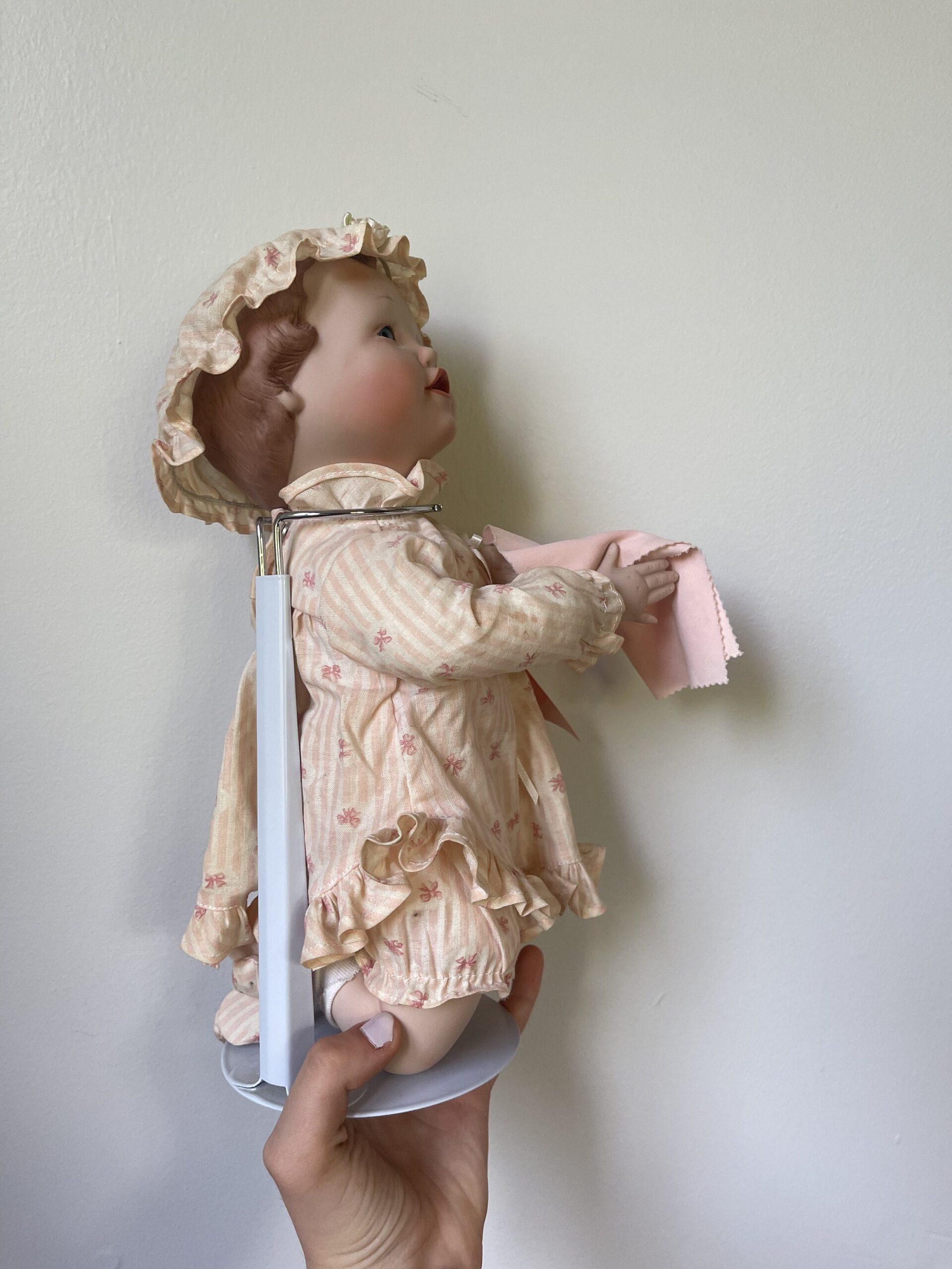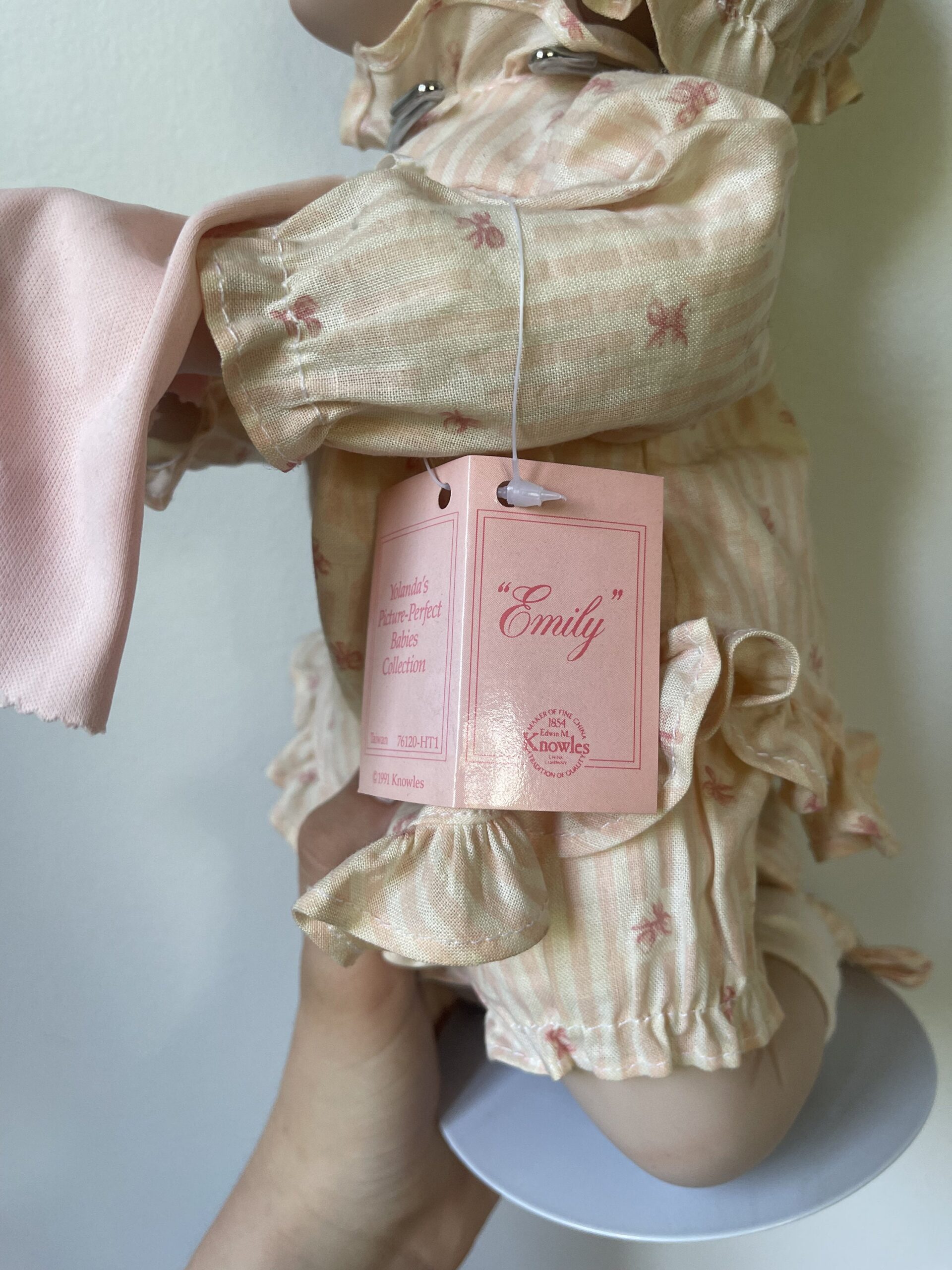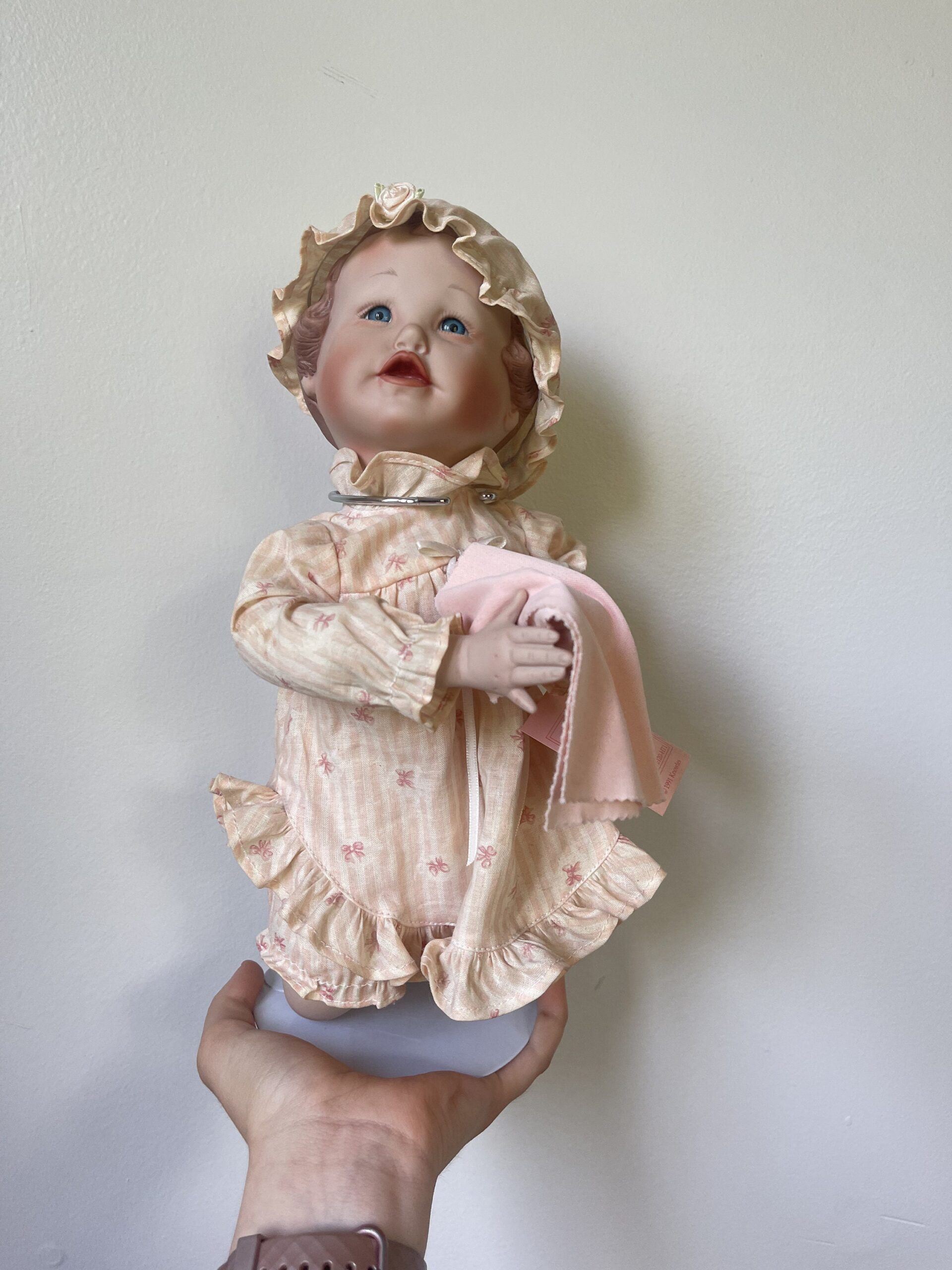 The combination of hat and pearls gives her a dressed-up, occasion-ready look that sets her apart from simpler designs. She represents the best of 1990s doll collecting aesthetics — quality craftsmanship with thoughtful accessorizing.